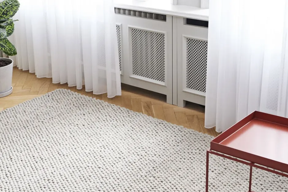 Peas er vævet i Indien. De farvede uldfiltkugler har små nuancer, der giver kollektionen et unikt og alsidigt udtryk.