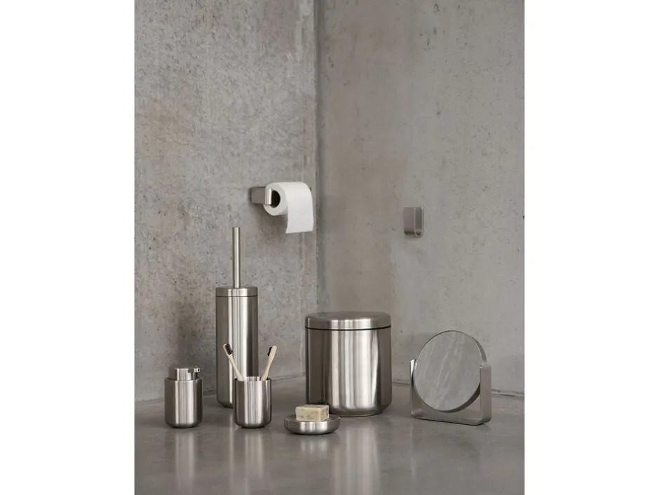 UME-serien har i flere år været et centralt ikon i Zones badkollektion. Nu udkommer serien i et eksklusivt nyt materiale, nemlig mat stål. Et oplagt valg til badeværelser og toiletter alle steder, hvor funktion og æstetik er i højsædet. De bløde organiske former får smukt modspil fra det stilrene og kølige stål i serien, som er skabt i samarbejde med designteamet VE2. I gulvhøjde byder serien på en mindre pedelspand samt toiletbørste i cylinderformet holder. Til væggen er der matchende toiletrulleholder samt kroge i elegant u-form med skjulte beslag. Til bordet findes både sæbedispenser, sæbeskål samt tandbørstekrus samt rundt bordspejl med vippefunktion. På trods af stålets mathed reflekterer lyset sig smukt i overfladen og giver overfladen liv og karaktér. Alt i alt en formfuldendt forvandling af en ægte Zone-klassiker.