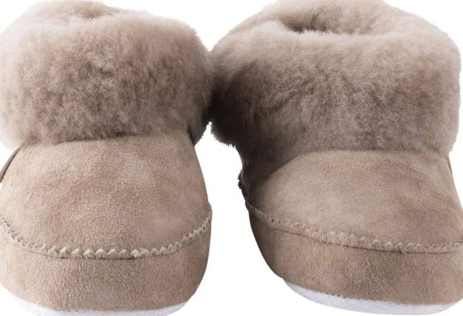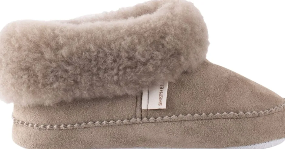 Shepherd Piteå er et par bløde og varme børnesutsko i fåreskind. Sutskoene er udformet i en ankelhøj model med en bred foldet kant i fåreskind. Dekorative syninger. Blød sål i ruskind.