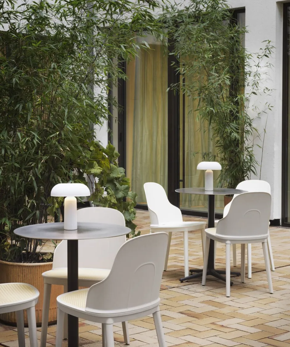 Porta Bordlampen består af en lampeskærm, der hviler på en robust, cylinderformet base, som begge er lavet af ABS-plastik. En hvid akryl diffuser sikrer en behagelig og jævn glød. En silikonebundring gør, at lampen kan stå sikkert.