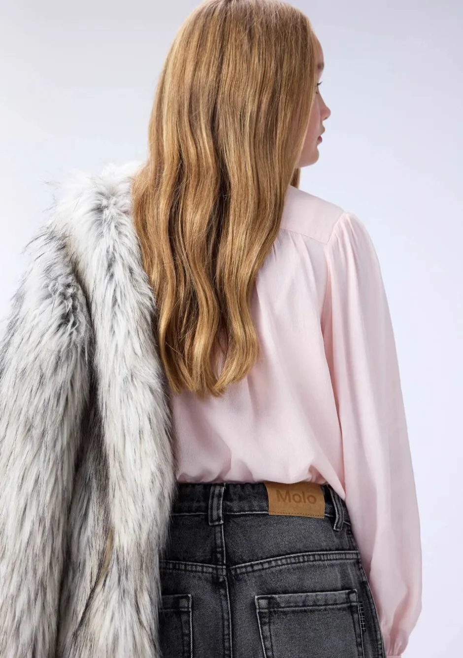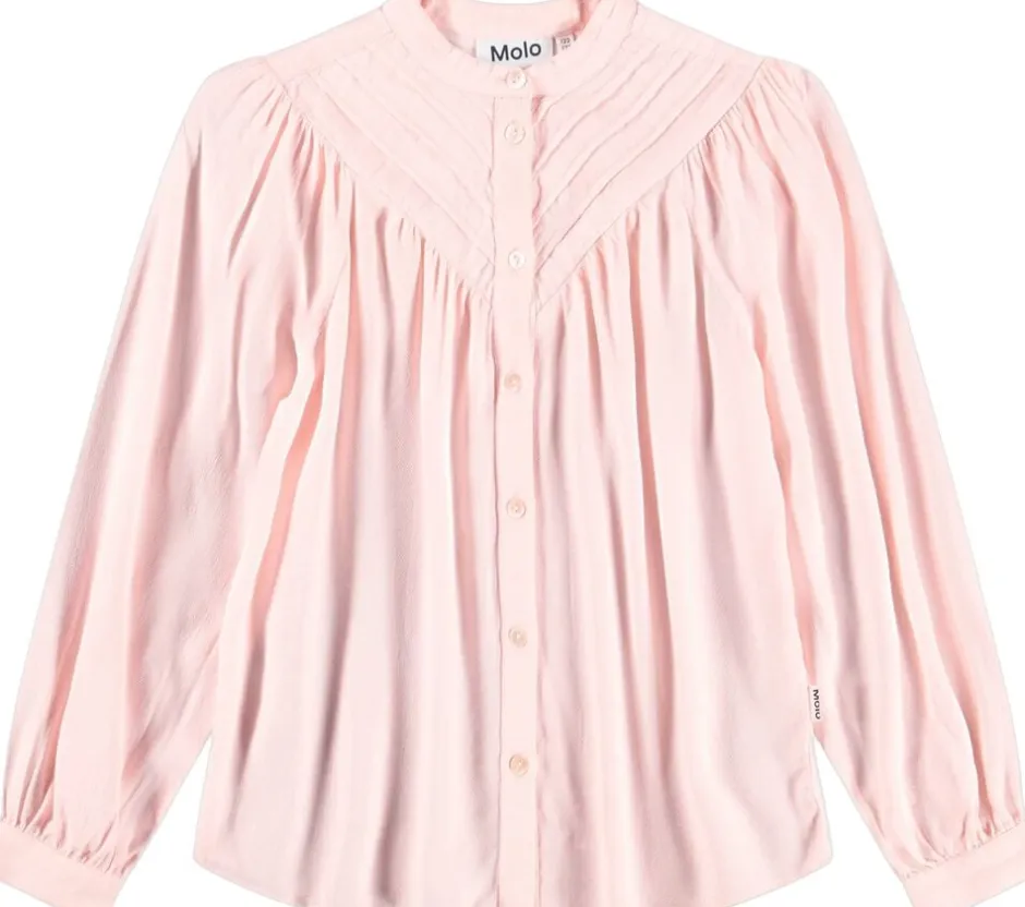 Denne lyserøde viskose skjorte fra Molo har knaplukning foran og ved ærmerne samt flotte paneler ved kraven. Skjorten har masser af rynk ved både krop og ærmer, hvilket skaber et flot fald.