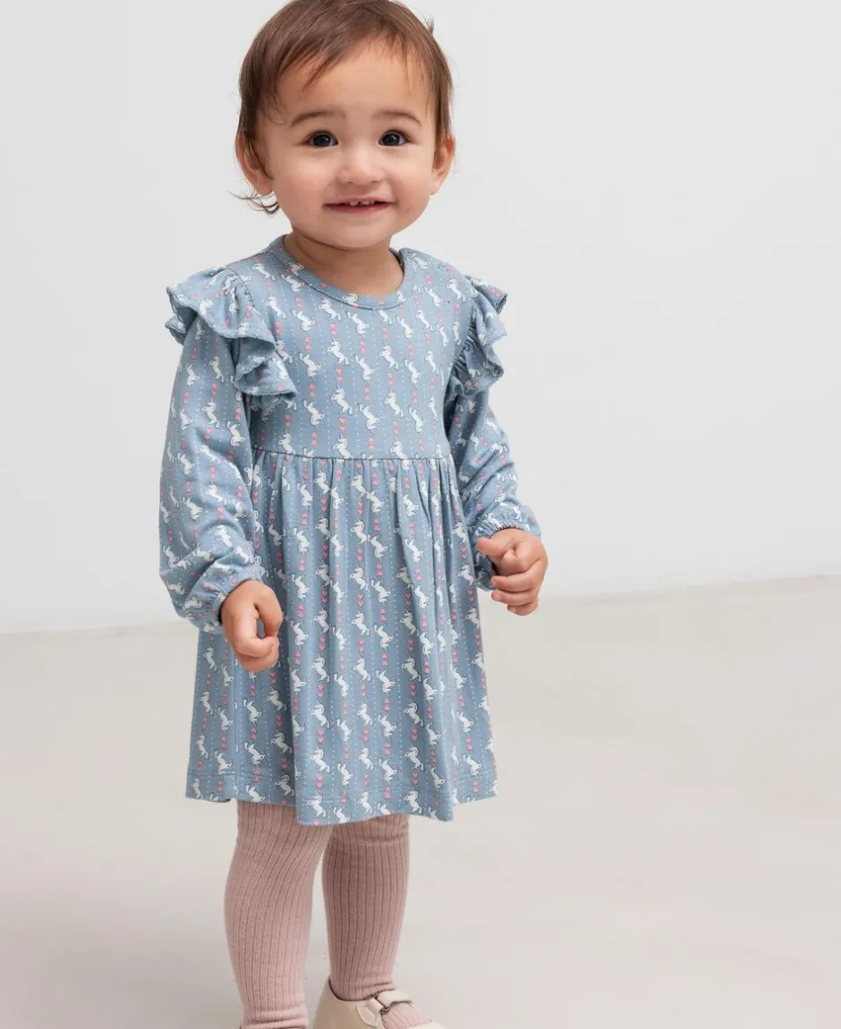 Lille kjole med bodystocking, flæsedetaljer og lange ærmer. Kjolen har et fint enhjørning print og bliver lukket med trykknapper mellem benene for nem bleskiftning.