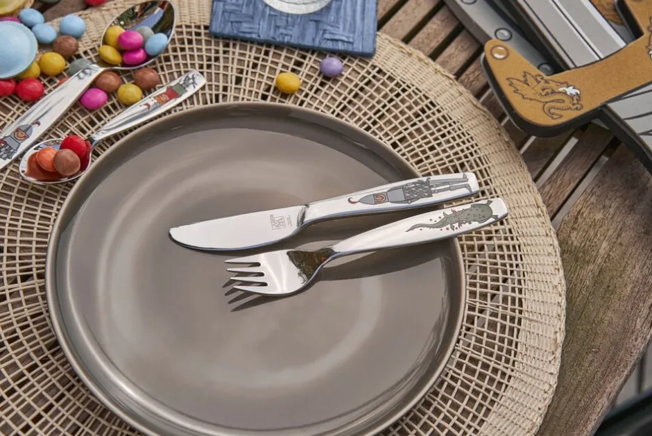 Spisebestikket i fire dele til børn fra Eckbert serien er perfekt til små hænder, som prøver kræfter med en kniv, gaffel og ske for første gang. For at gøre det til en sjov oplevelse er bestiksættet dekoreret med sjove ridder-figurer.