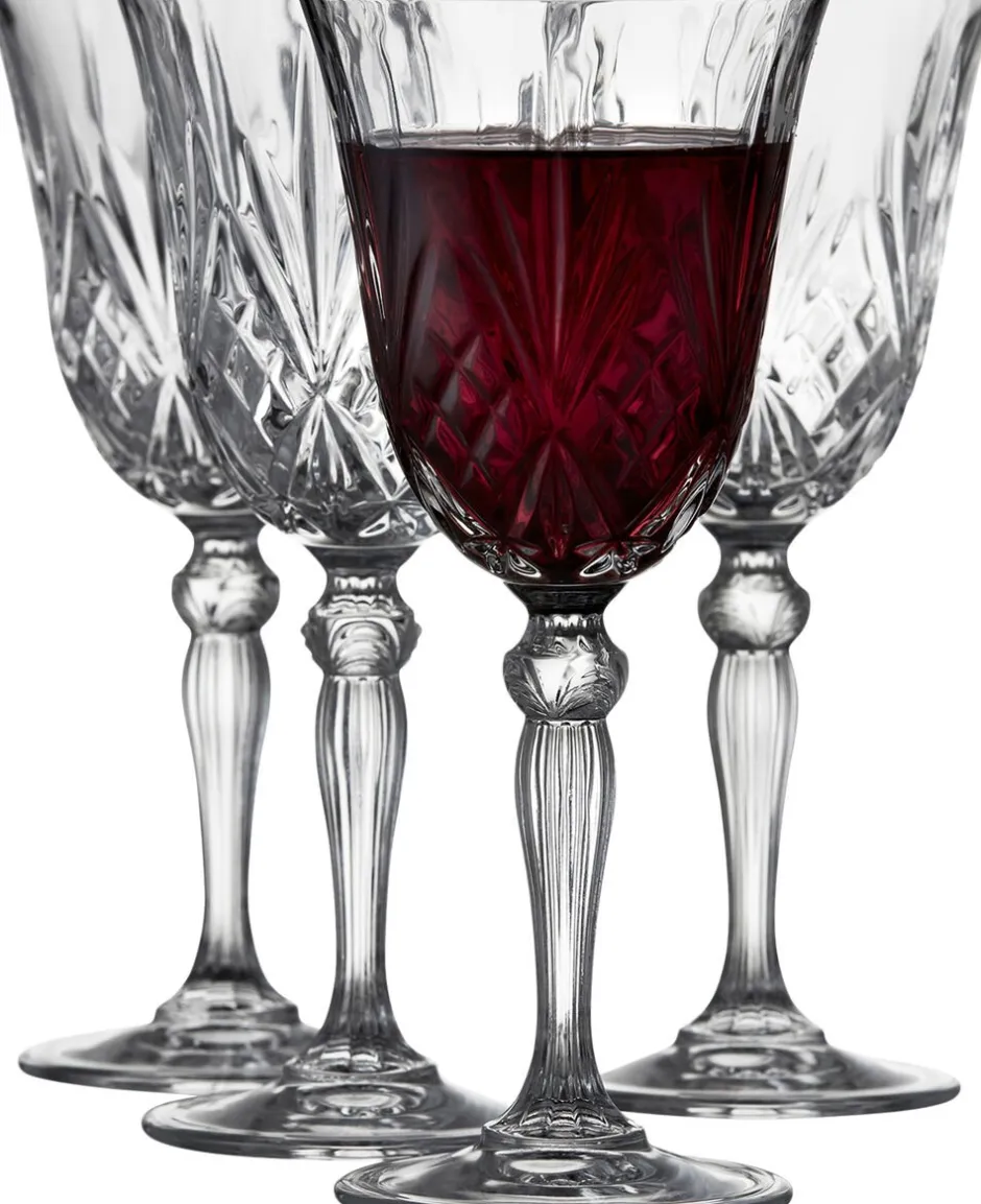 Vinens farve fremhæves elegant, når glassets smukke mønster reflekterer omgivelsernes lys og skygger. 4 stk. glas 27 cl. H 20 cm.