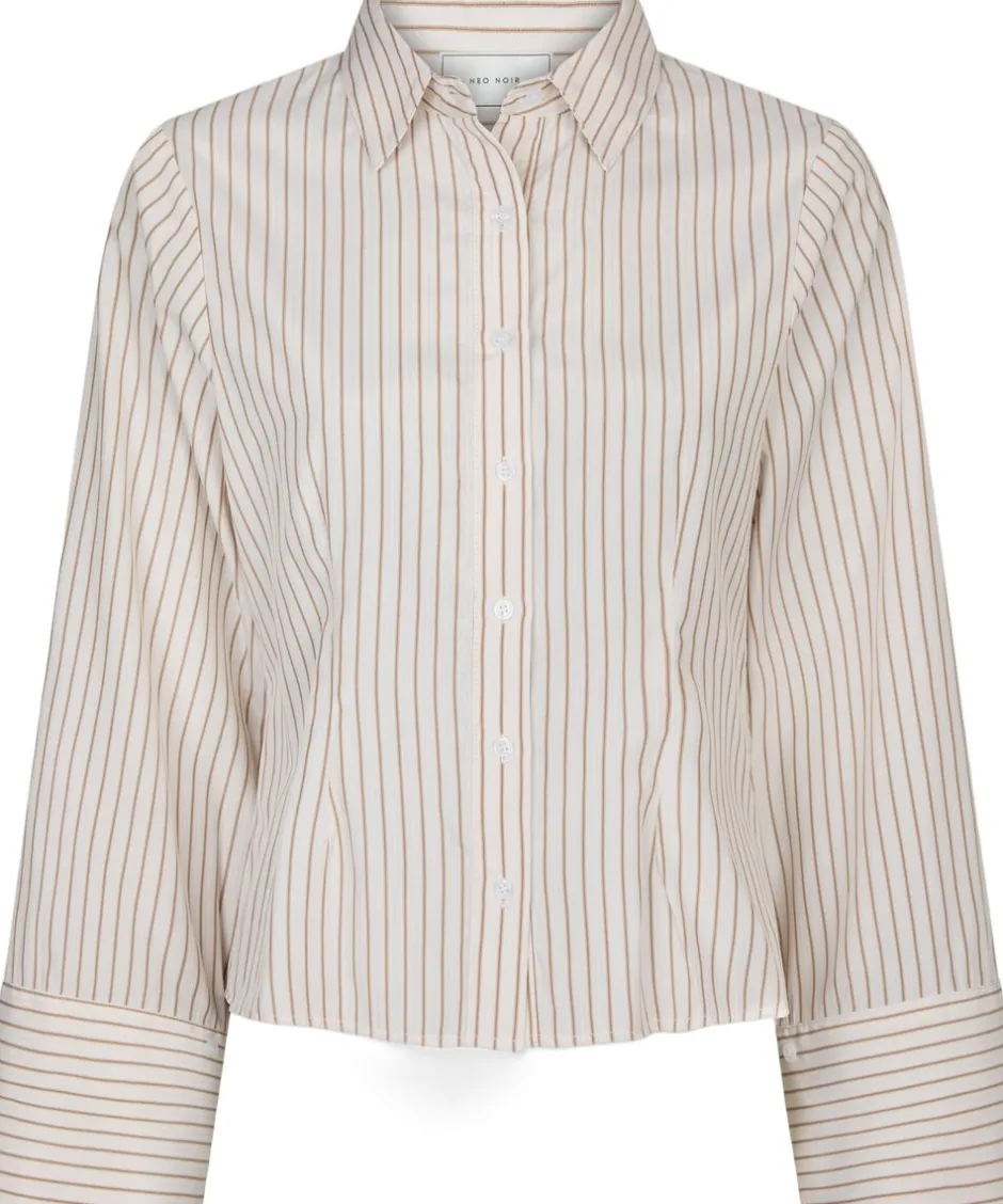 Stribet skjorte med lange ærmer. Skjorten har en klassisk krave, knaplukning langs fronten samt brede ærmer og manchetter, der lukkes med en enkelt knap. Den har en kropsnær pasform og er lavet i en bomuldsblanding. Modellen er iført størrelse 36.