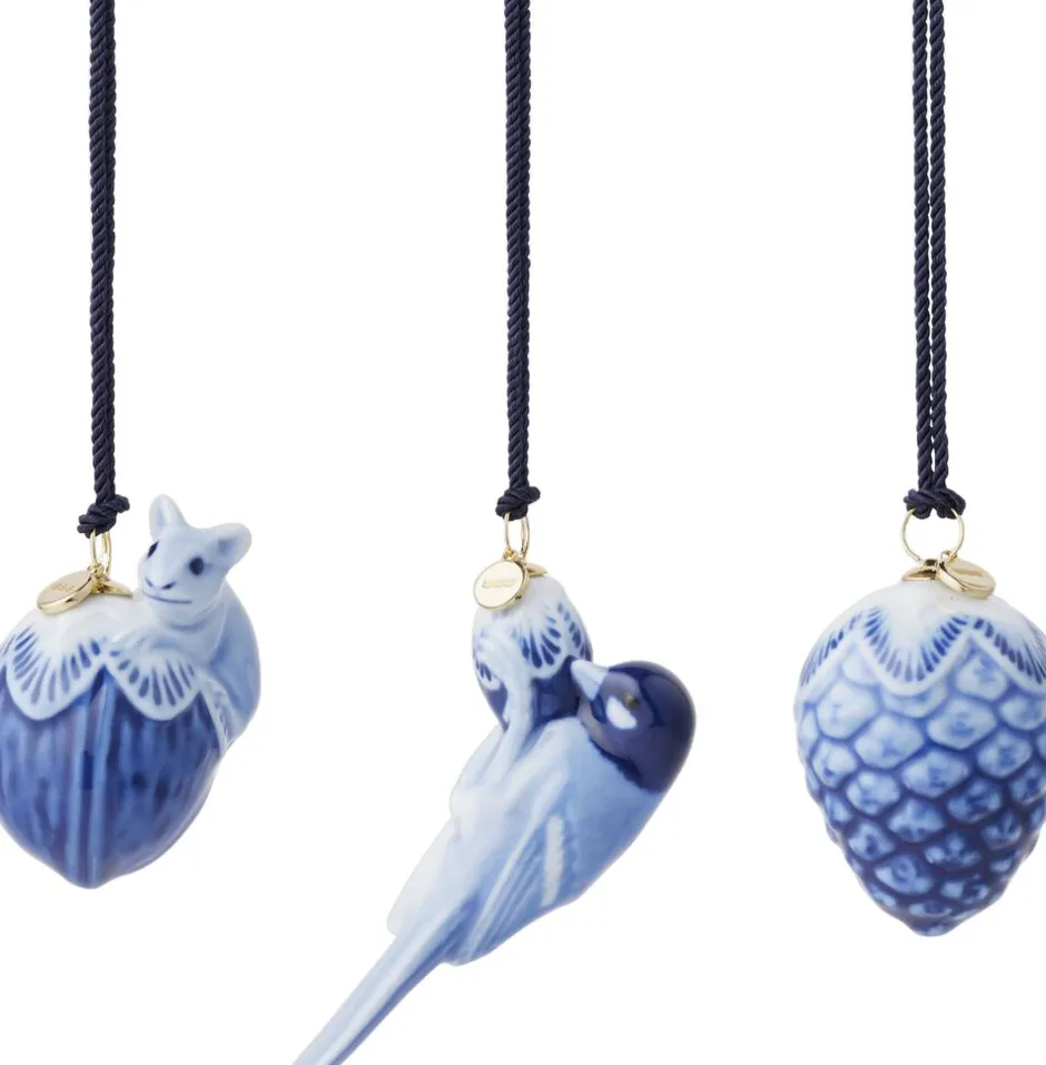 Pynt juletræets grene med disse tre fine porcelænsornamenter, der emmer af vinterens poesi. I delikate blå nuancer skildrer de en grankogle, en valnød med en lille mus og en fugl, der nænsomt piller ved en nød. Hvert ornament bringer en subtil elegance og en fortælling om naturens skønhed til juletræet.
