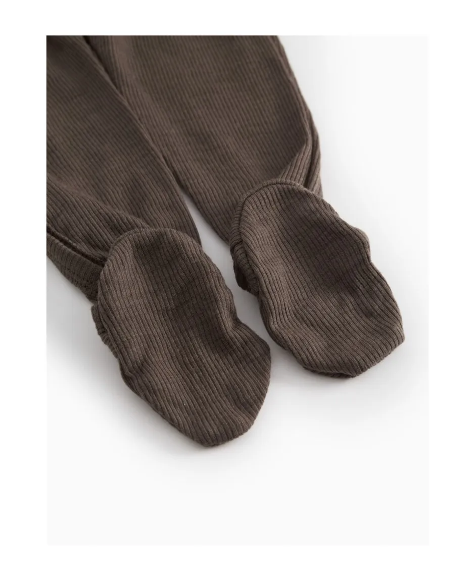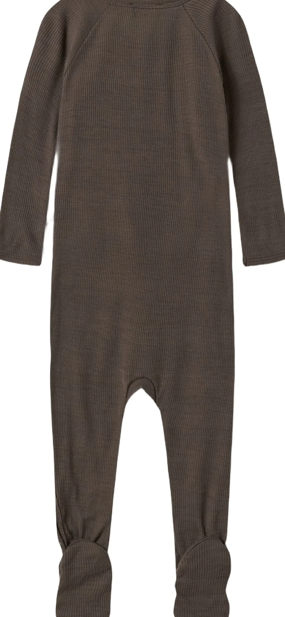 Langærmet heldragt med fødder til nyfødte. Heldragten har slå-om-lukning og lukkes med trykknapper og bindebånd