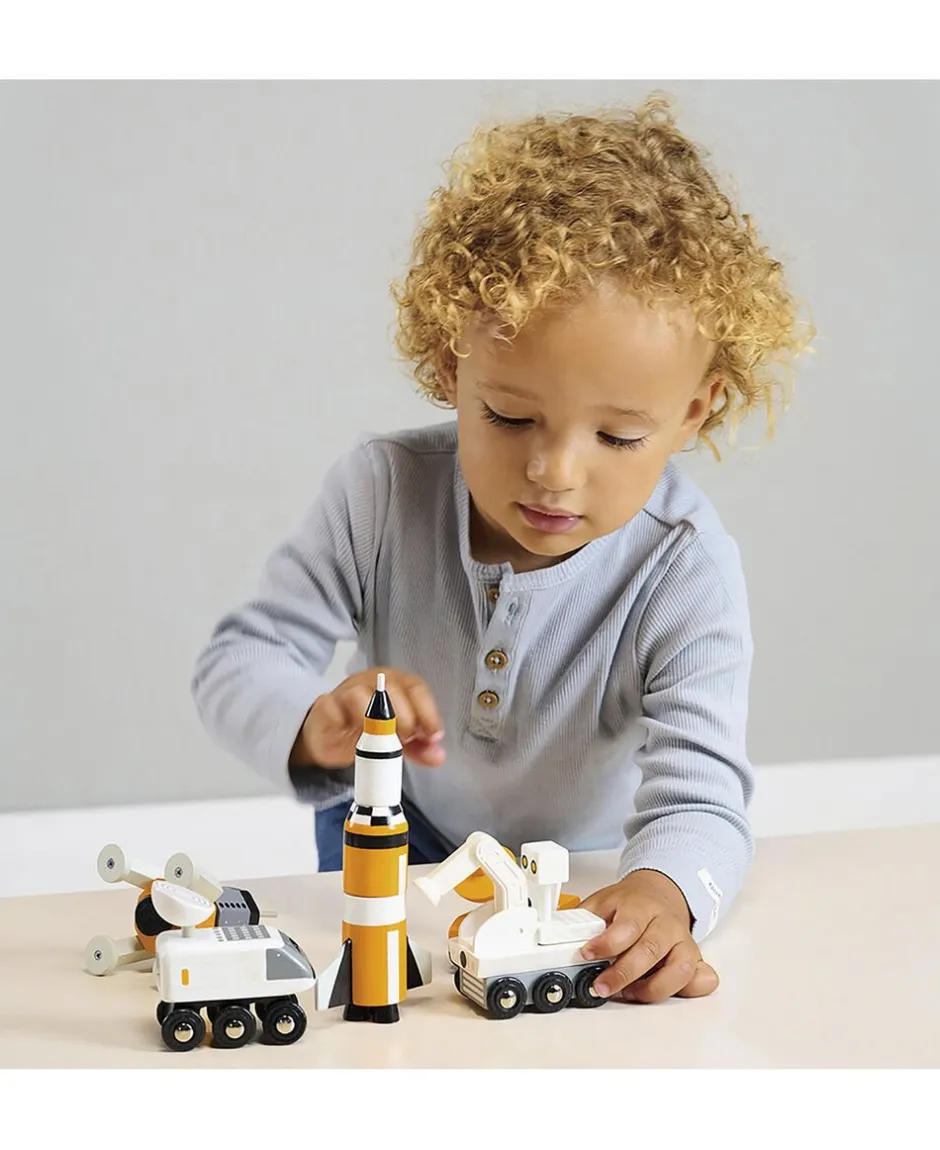 Indhold: 3-delt raket, månelandingskapsel, månekøretøj, besætningsrover, månesonde.