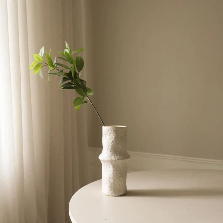Denne Green Ruscus Leaves stem har flere grene med aflange, spidse grønne blade i forskellige nuancer med en glat, mat tekstur. Bladene er fastgjort til en slank, mørkegrøn stilk og når en højde på 82 cm. Den store keramiske jordvase på billedet måler 30,5 cm i højden og 10 cm i diameter.