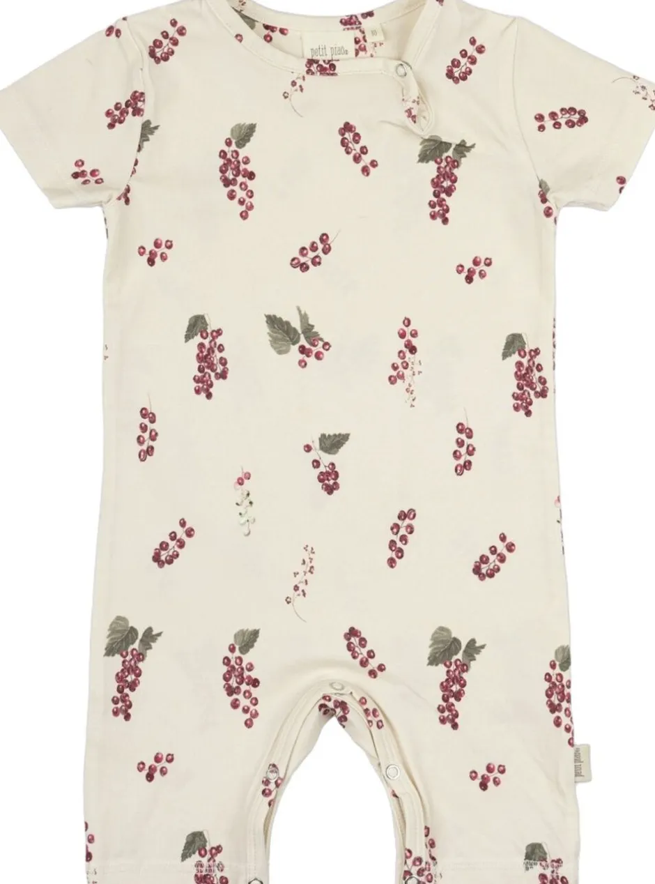 Kortærmet jumpsuit med vandfarveprint fra Petit Piao i økologisk bomuld. Printene er inspireret af naturen og alt omkring Jyllands vestkyst. Printene har en offwhite baggrund, så printet er i fokus. I venstre side af halsåbningen er der en trykknap, der gør det nemmere at få jumpsuiten over barnets hoved. Der er trykknaplukning i ben åbningen. Produceret i Indien.
