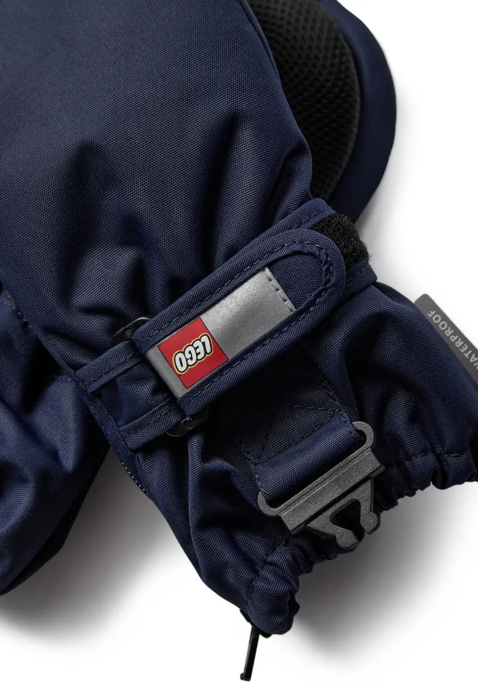 - Der er et sikkerhedsspænde på lufferne til at klikke dem fast til ærmerne på LEGO vinterjakker eller flyverdragter. Hvis der rykkes i luffen, løsnes den fra ærmet, og det mindsker risikoen for uheld, hvor barnet hænger fast i noget.