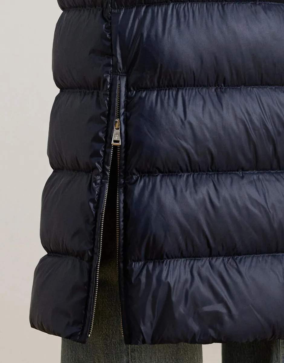 Denne maxi-frakke er fyldt med 650-fyld-dun, har en metallisk finish, en voluminøs skorstenshals og kanalquiltning, hvilket skaber en stil, der er både praktisk og smart