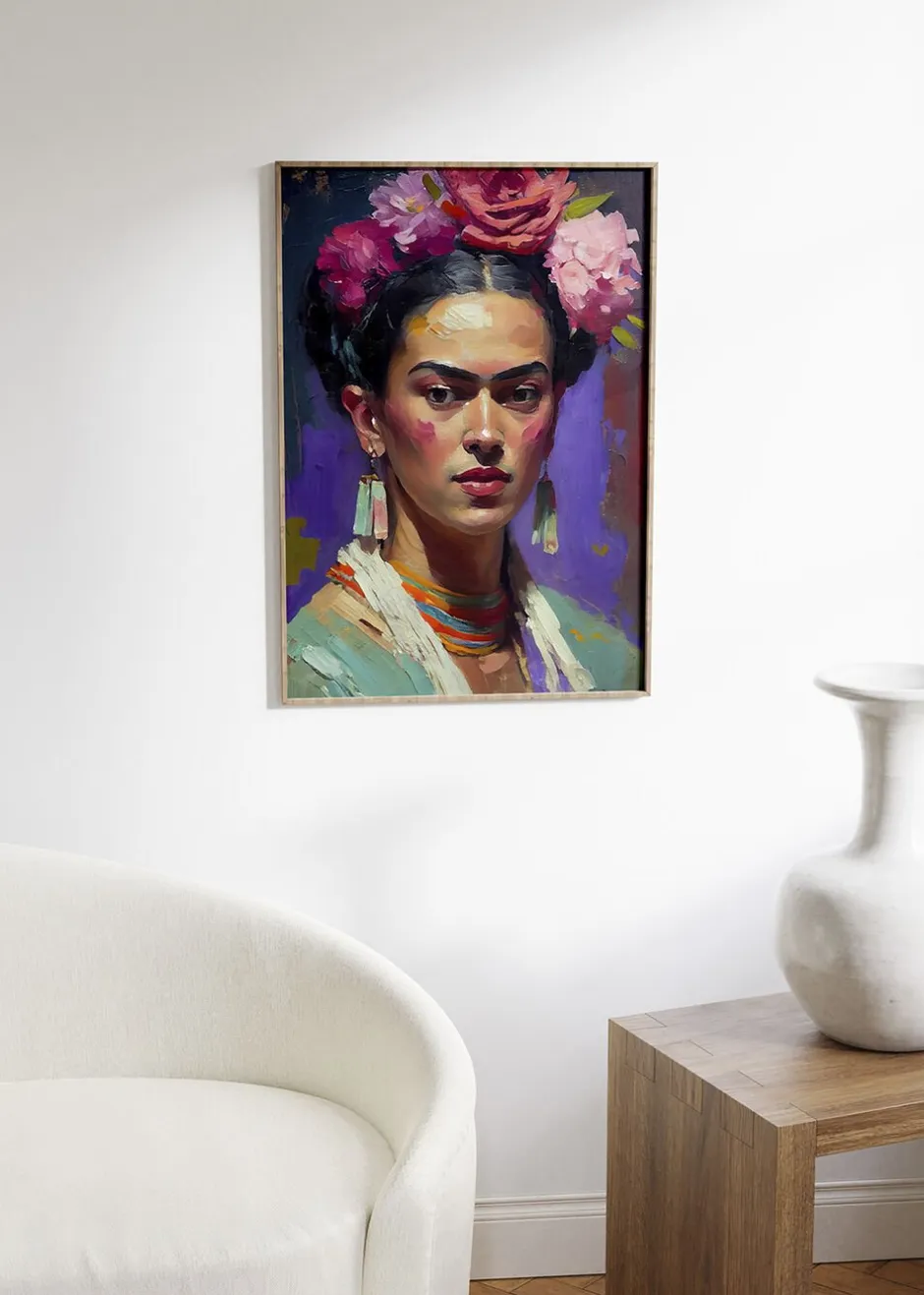Portrait Of Frida” by treechild depicts Frida Kahlo in a captivating painting. This artwork showcases a vibrant palette of green, white, rose, orange, and black. Frida’s face is beautifully portrayed, capturing her unique spirit. This painting is a remarkable piece of art suitable as a statement in any space. *Please note that frames are sold seperately.