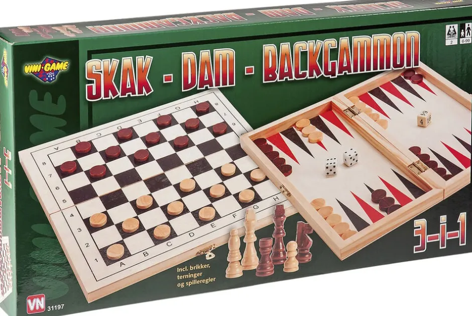 3-i-1 skak. dam, backgammon I træ Komplet med spilleregler
