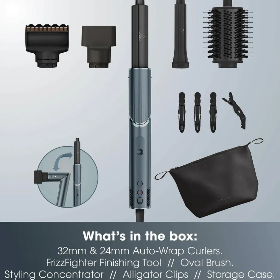 Auto-Wrap Curlers, der automatisk krøller håret. Paddle Brush til glatning og tilføjelse af glans. Oval Brush til volumen og glans. Styling Concentrator til professionel styling. Curl-Defining Diffuser til hurtig tForkæl dig selv med en eksklusiv oplevelse i din