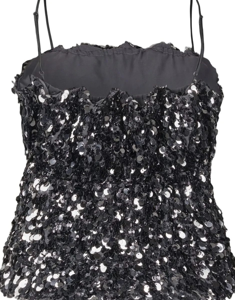 Second Female stroptop med pailletter. Toppen har pailletter i forskellige størrelser på en tone-i-tone-baggrund. Smalle stropper med justerbare spænder og elastiske sømme under brystet. Helforet. Tæt