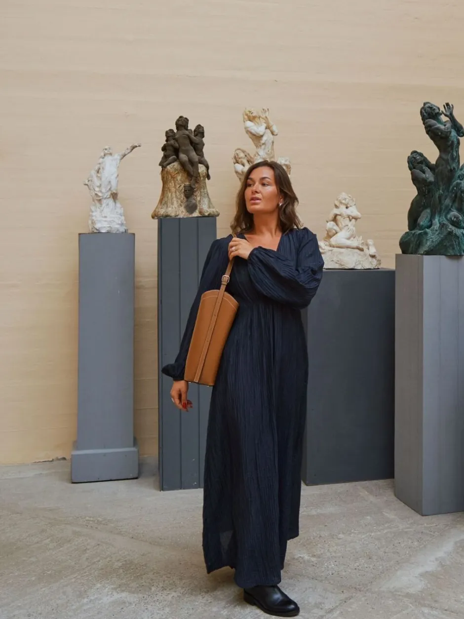 Maxi kjole i en crepe-kvalitet. Kjolen har en V-halsudskæring, lange pufærmer med elastik ved håndleddene, læg foran og skæres under brystet. Den er lavet i et let gennemsigtigt materiale med for og har en almindelig pasform. Modellen er iført størrelse 36.
