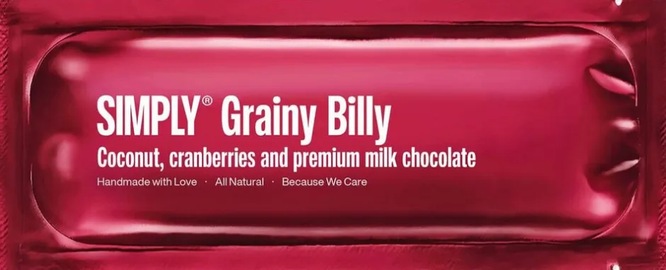 GRAINY BILLY – entwistetklassiker. Et genialt mix af knasende kokos, blød hvid chokolade og frugtige tranebær overtrukketmed premiummælkechokolade, helt uden kunstige tilsætningsstoffer. Den perfekte smagsoplevelse til dig,der elsker den søde drøm om sol, strand og sommer.