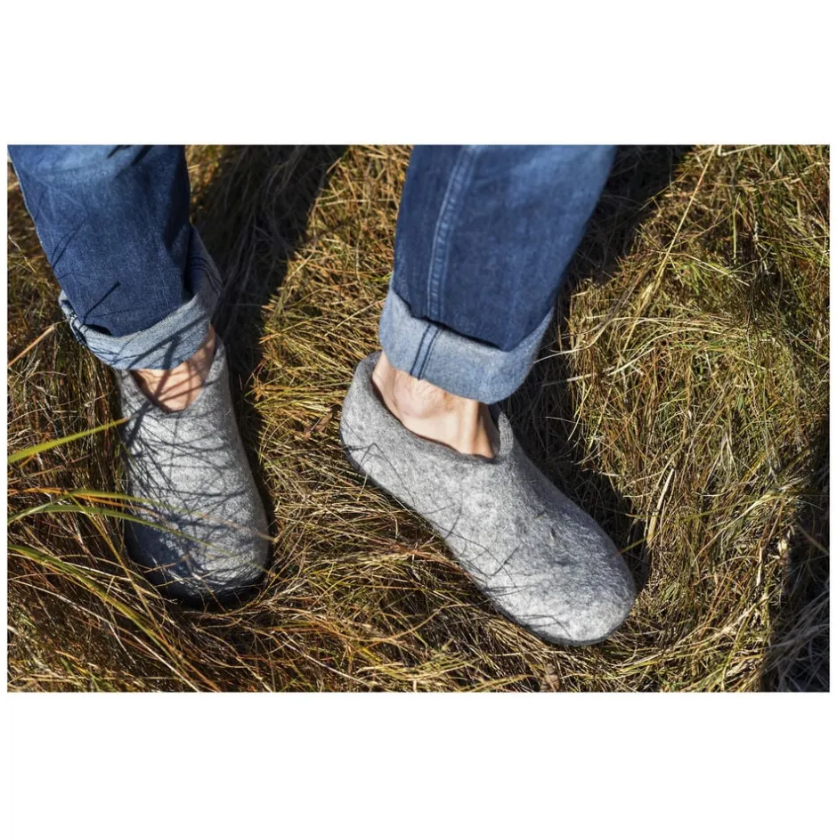 Hjemmeskoene er dansk designet og har overdel i uldfilt der rigtigt forkæler dine fødder. Uld har mange gode egenskaber. Bl.a. mister det ikke sine isolerende egenskaber i fugtig tilstand hvilket sikrer at dine tøfler altid føles lune