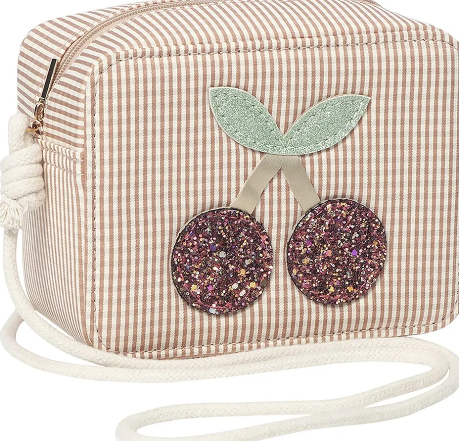 Klassisk ternet skuldertaske dekoreret med et par store, glitrende kirsebær.1 rum og lynlås. Stroplængde 48 cm.