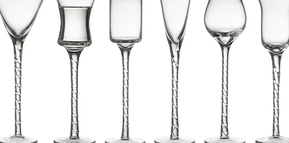 6 forskellige mundblæste snapseglas med snoet stilk bidrager til en god stemning ved bordet, og det er nemt at finde sit eget glas. Snapseglassene i klart glas har forskellige udformninger og indeholder fra 2,5 op til 5 cl. H 18 cm.
