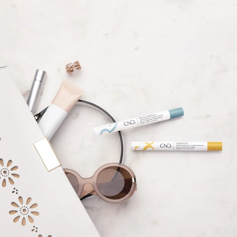 CND SolarOil er til ødelagte og svage negle med en keratinkur og den ultrafugtgivende SolarOil som sikrer sunde og stærke negle og hjælper med at forebygge skader som negle der flosser, knækker eller har tendens til misfarvning. SolarOil indeholder ingredienser, der hjælper med at reparere, fugte og pleje neglene. Med disse to nye ”twist” penne med enkel og effektiv applikering og et mindre produktspild, er dette et must i hverdagstasken for flotte og modstandsdygtige negle på farten.