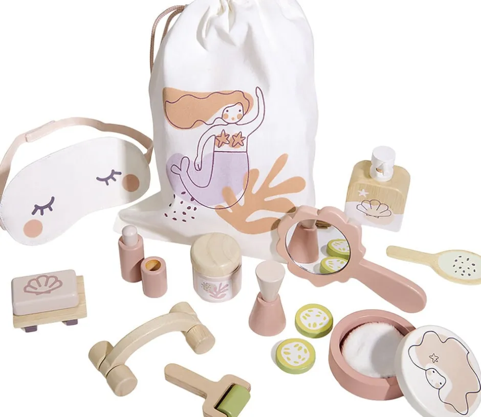 En opbevaringspose med snoreluk og illustration af en smuk havfrue, rummer alt det tilbehør, der skal til et spaophold såsom en stof-øjenmaske, massagerulle, spejl, fodfil, neglelak og skiver af agurk til at dække øjnene.