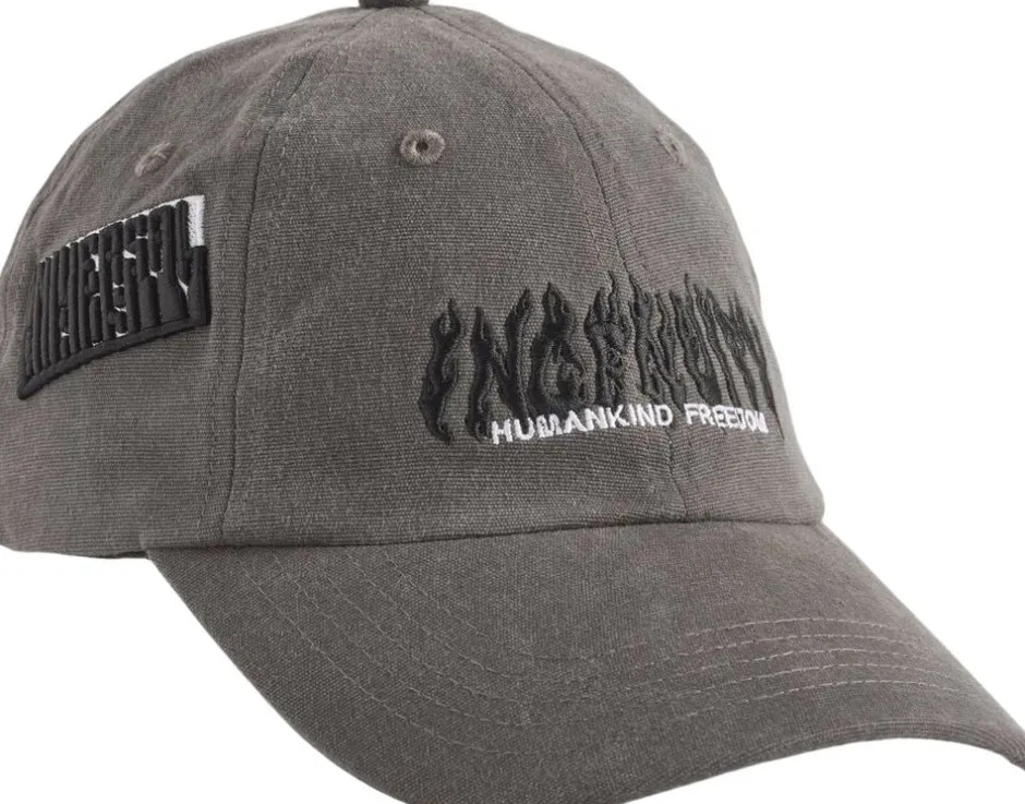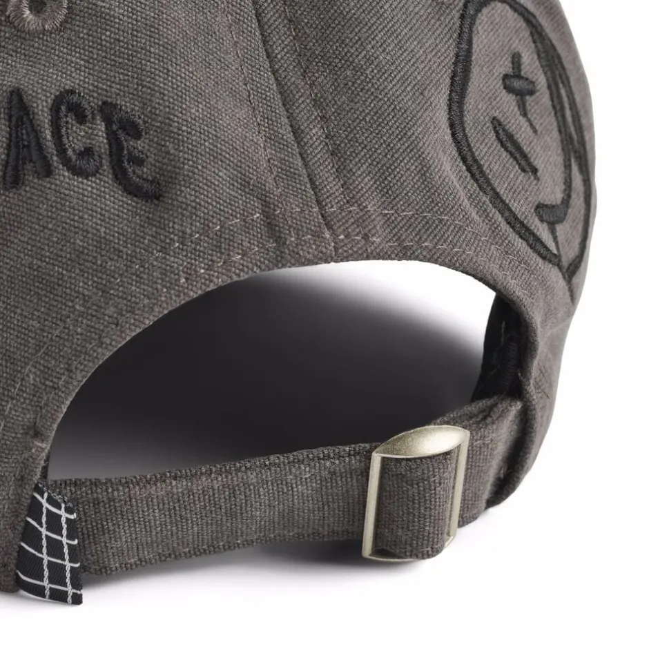 Grå kasket fra Molo i bomuldsblanding med et vasket denim look, sorte broderier, en let bøjet skygge og justerbar lukning i nakken.