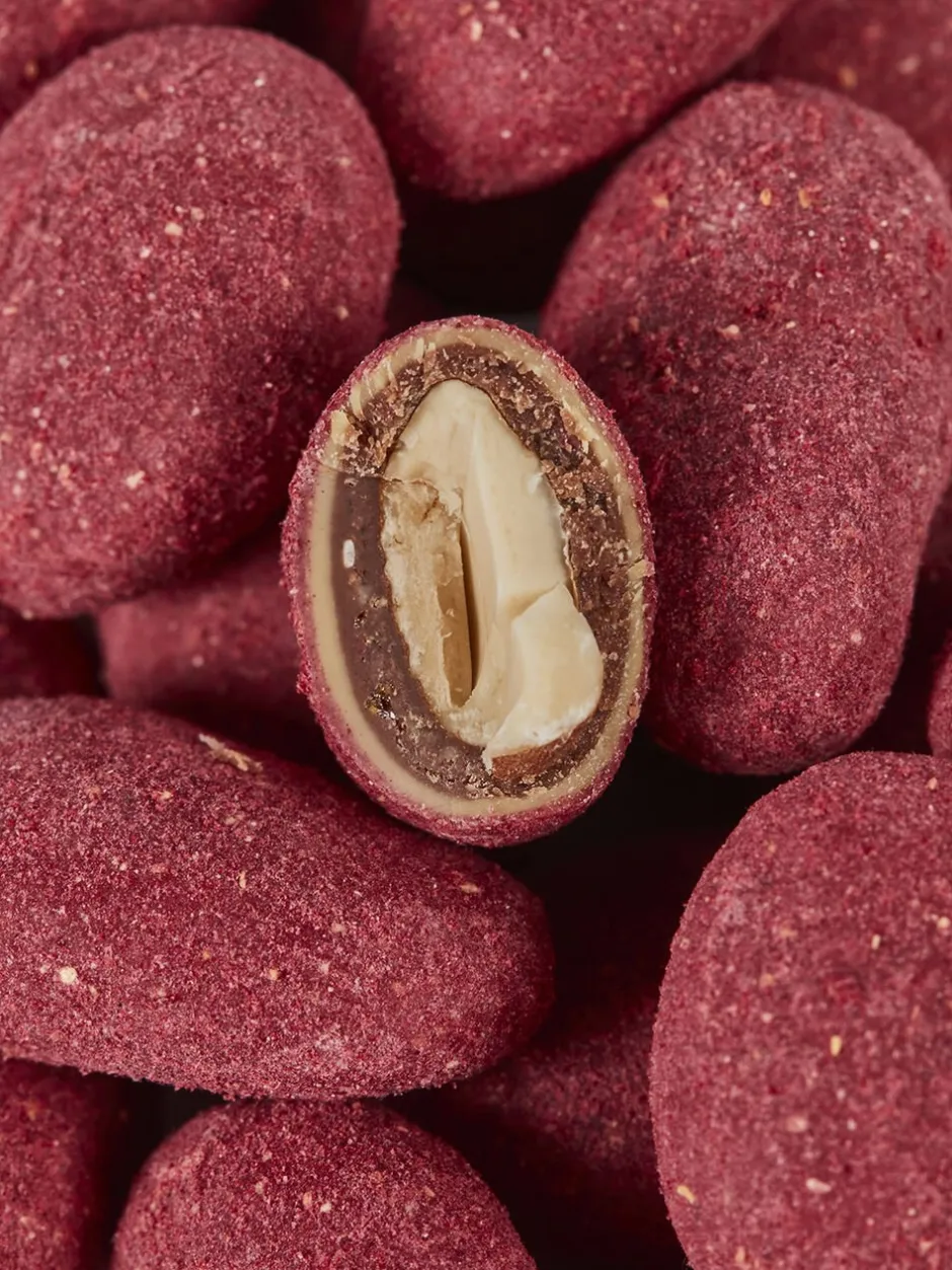 Let ristede økologiske spanske mandler, drageret i praliné, Amber Classic-chokolade og vendt i det fineste pulver af solmodne hindbær. En mandel med sødme og frugtighed fra de solmodne hindbær, dybde fra den karamelliserede Amber Classic-chokolade og umami fra de sprøde spanske mandler.