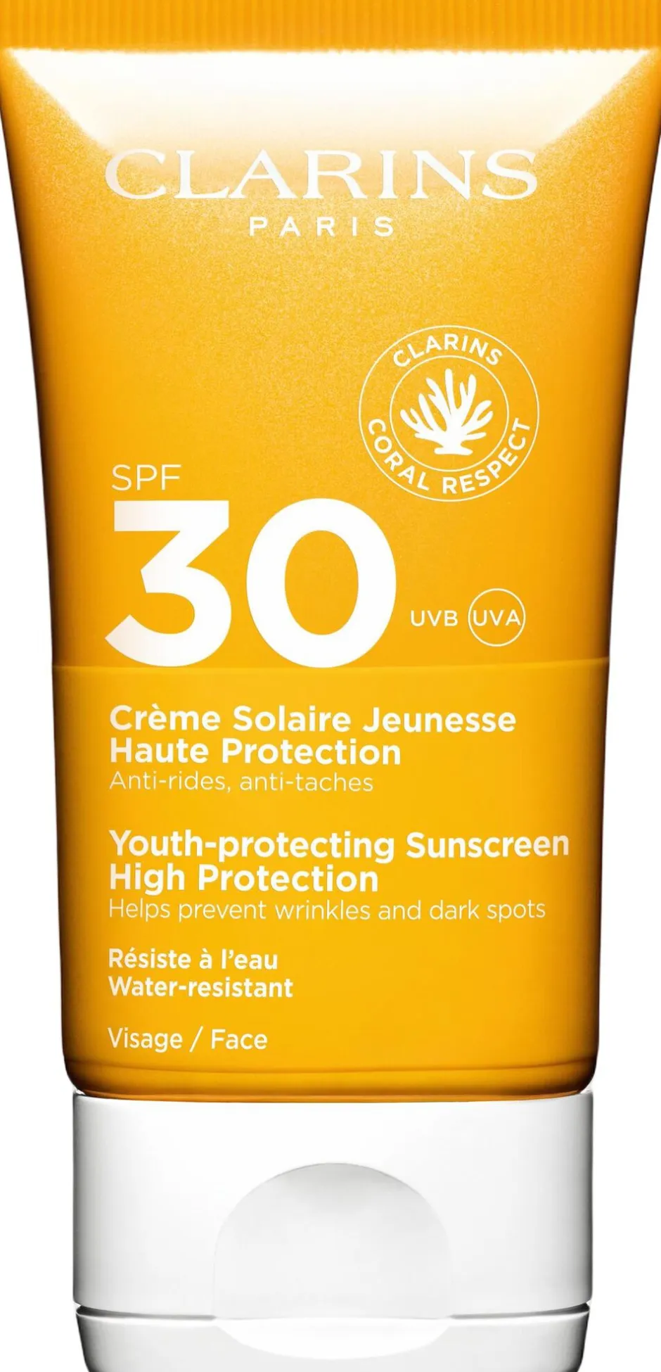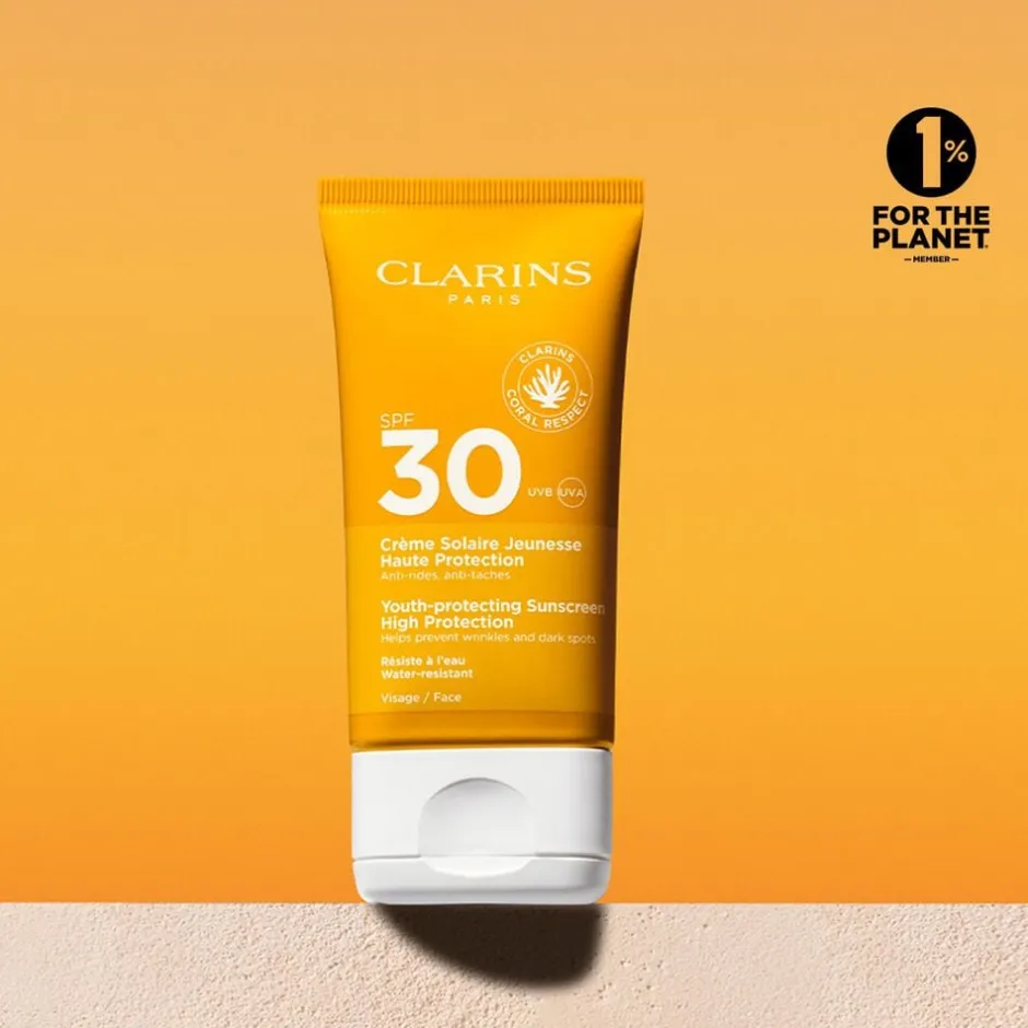 En høj beskyttende solcreme med faktor 30 til ansigtet. Beskytter mod UVA- og UVB-stråler. Giver en ensartet, holdbar og solbrun farve samtidig med at den beskytter huden mod sol-fremkaldte ældningstegn. Sådan bruges den: Gentag ofte indsmøring af sensitive områder. Smøres ind i et tykt lag, mindst hver anden time og altid efter svømning. Dens glatte, fine tekstur og hurtigt absorberende effekt hjælper med at fremme en mat finish. Få farven til at holde længere ved om aftenen at bruge Clarins After Sun Balm eller Gel. Clarins sol-serie er multi-cellebeskyttelse og beskytter huden mod sol-fremkaldte ældningstegn såsom linier og mørke pletter.