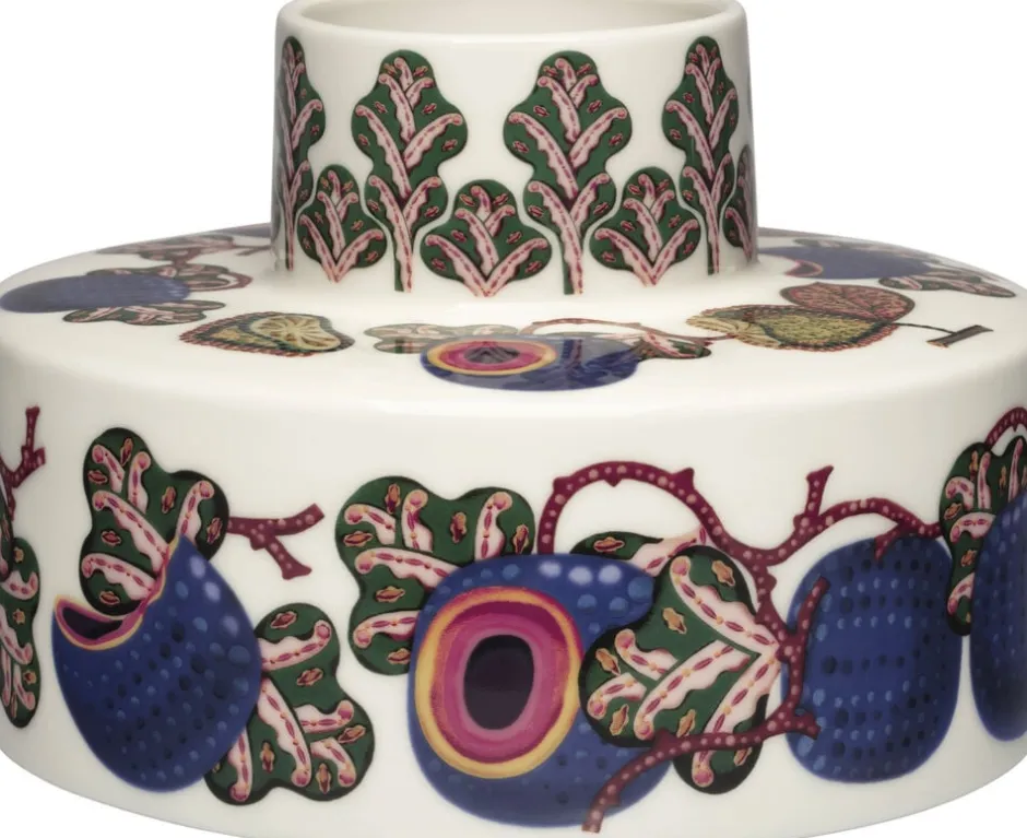 Taika Sato keramisk vase er en smuk tilføjelse til ethvert hjem. Med sit skulpturelle design fungerer den som en fængslende centrepiece til at vise sæsonens blomster og grene. Inspireret af stillebenskunst bringer Taika Sato’s livlige skildringer af magiske frugter og grøntsager naturlig skønhed til dit borddækning og din generelle hjemmedekoration.