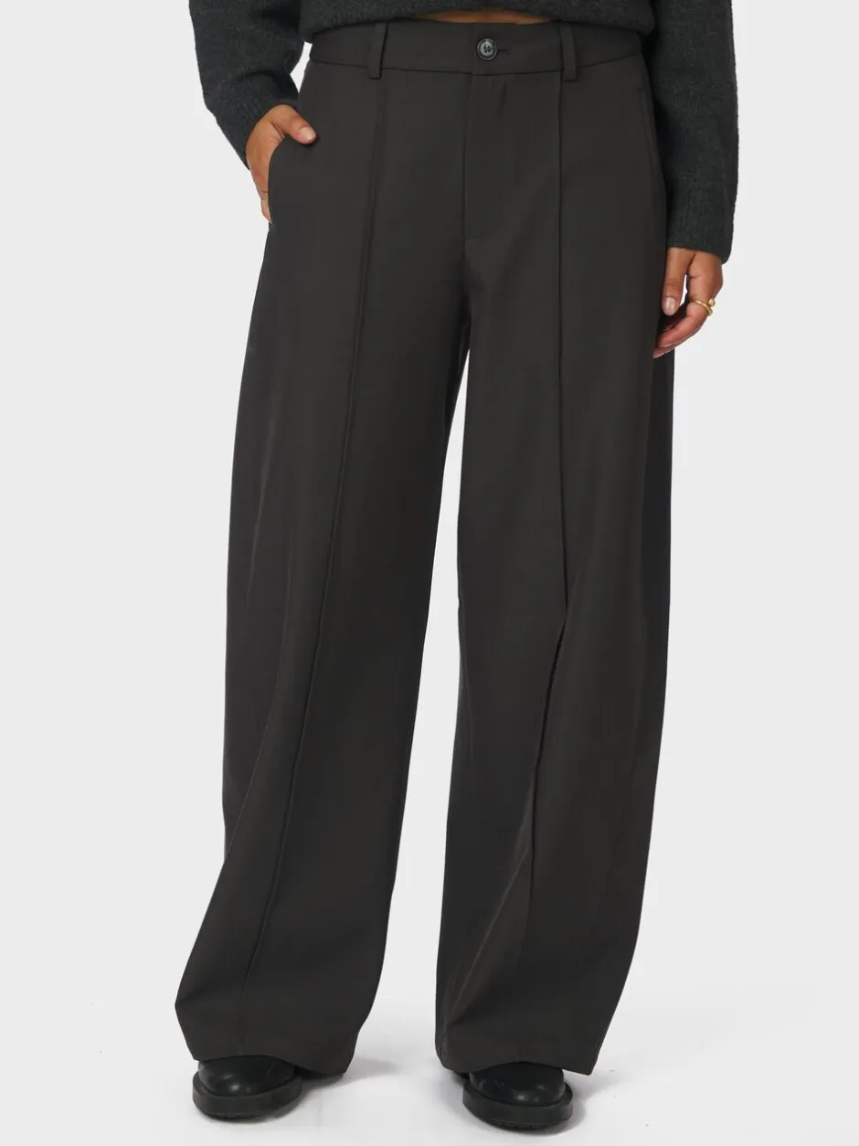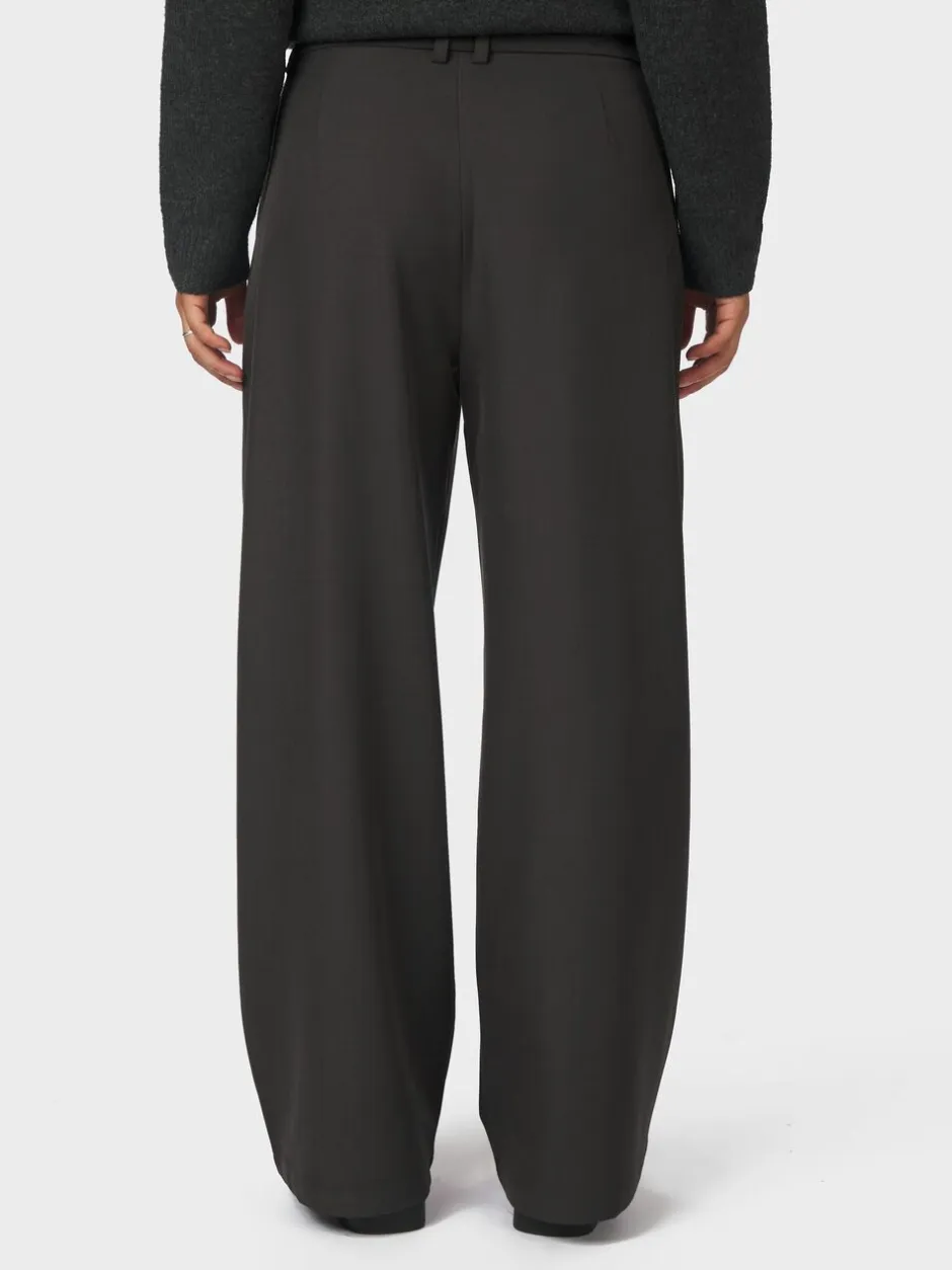 Barrel habitbukser med mellemhøj talje. Bukserne har buede ben med vidde, sidelommer og lukkes med skjult lynlås samt en knap. De har en løs pasform. Modellen bærer størrelse 36.