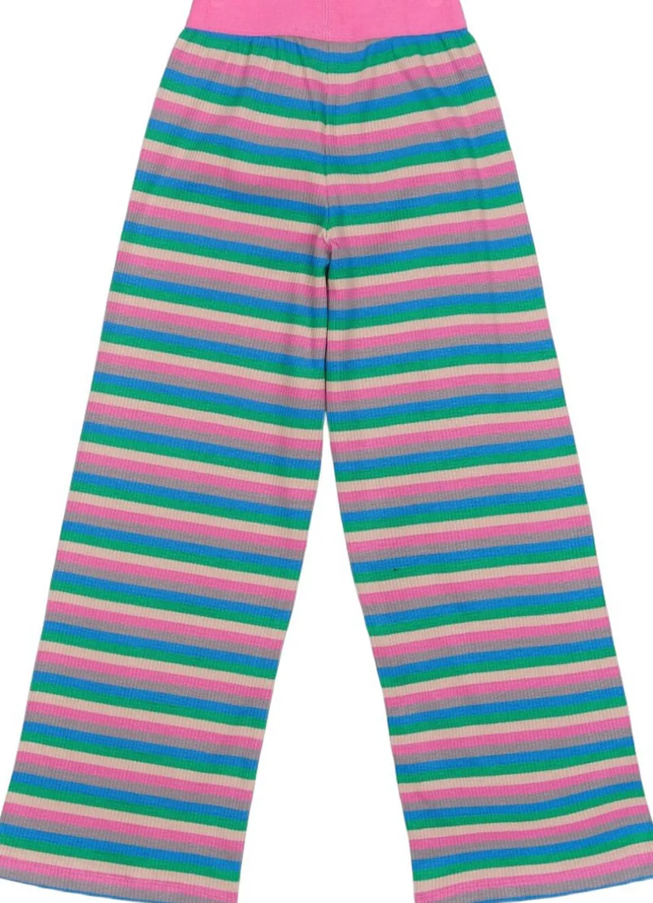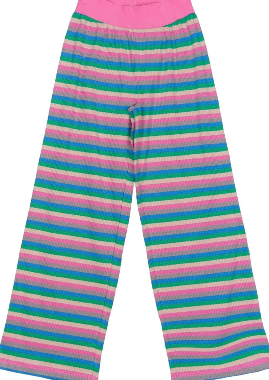 Disse stribede wide-leg bukser fra THE NEW har et legende og farverigt mønster i nuancer af pink, grøn, lilla og blå. De er lavet af et blødt ribbet materiale, der giver både komfort og stil. Den høje talje er afsluttet i en kontrasterende pink farve, hvilket tilføjer komfort til det sjove og livlige design. Bukserne er perfekte til hverdagsbrug og giver en afslappet pasform og et ubesværet stilfuldt look. De kan styles sammen med den matchende TNPiper rib tee for et koordineret sæt eller bruges alene for et farverigt indslag i din garderobe. – Wide-leg pasform – Blødt ribbet stof – Elastisk høj talje – Multi-farvet stribet mønster – GOTS Organic certified by CU842535