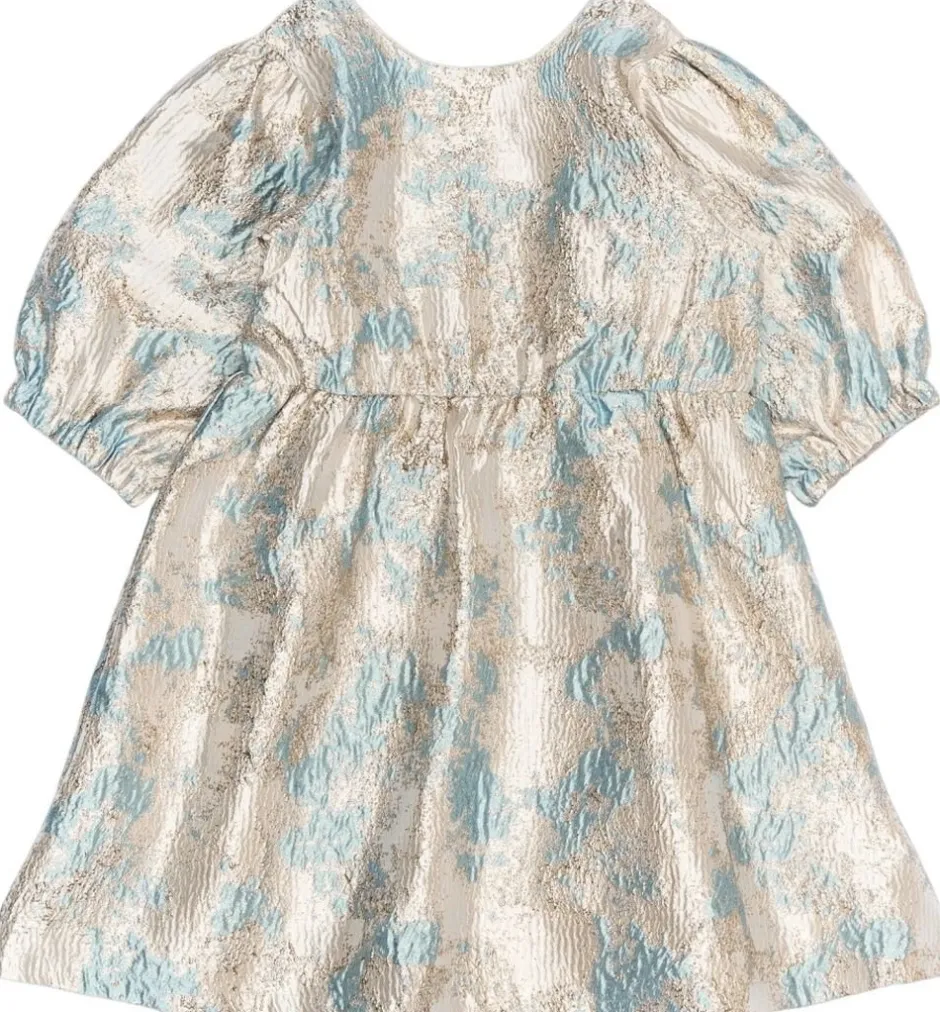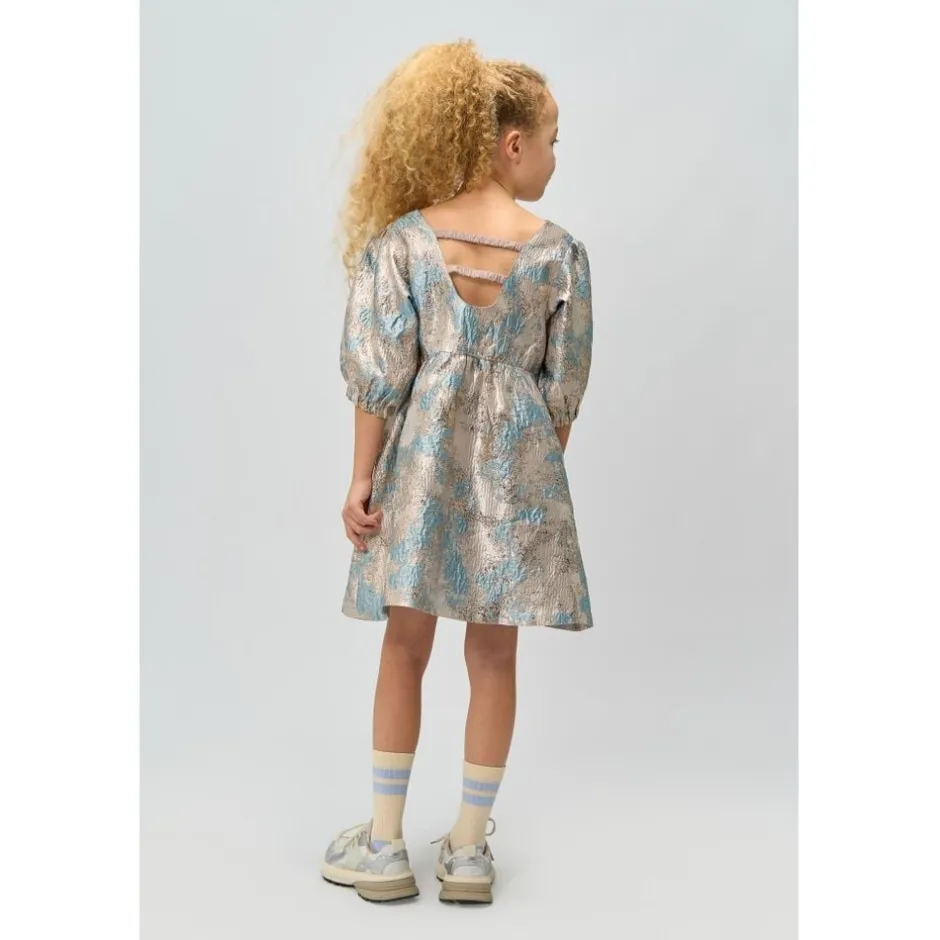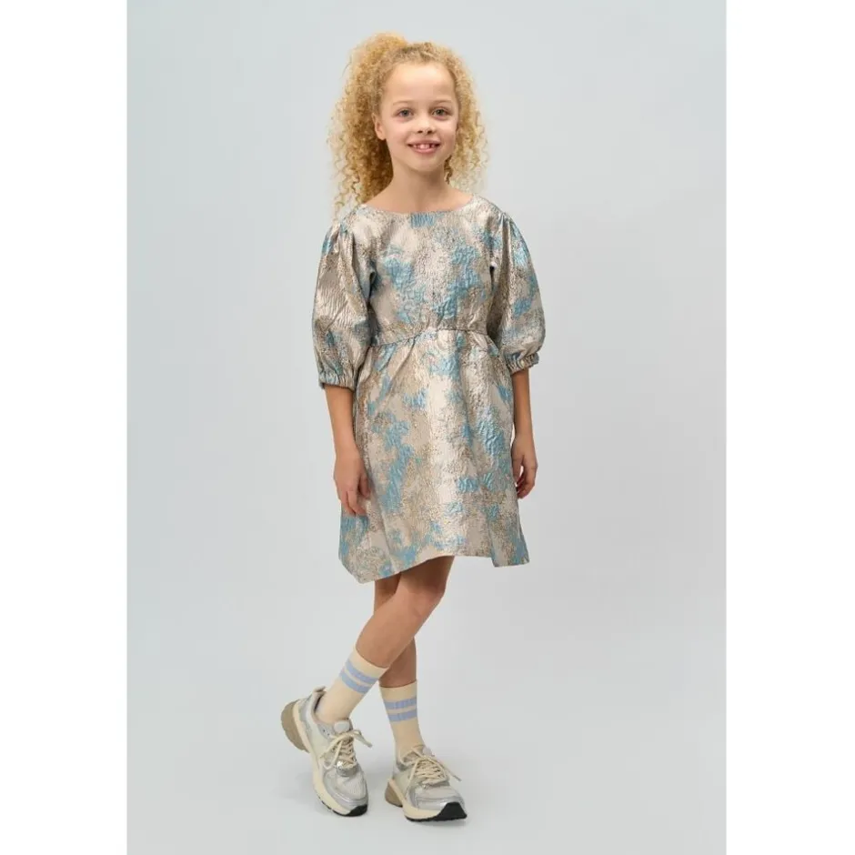En smuk og elegant kjole fra THE NEW med et eksklusivt brokademønster i gyldne og blå nuancer. Kjolen har en let A-formet silhuet, der skaber en fin og luftig bevægelse. De korte pufærmer og den elastiske talje tilføjer et feminint touch og en behagelig pasform. Som en ekstra detalje har kjolen en lille åbning på ryggen med elastik, der giver et stilfuldt og moderne udtryk. – Let A-formet pasform. – Skinnende brokademønster i gyldne og blå nuancer. – Korte pufærmer for et elegant look. – Elastisk talje for en behagelig og fleksibel pasform. – Lille åbning på ryggen med elastik for en moderne detalje.