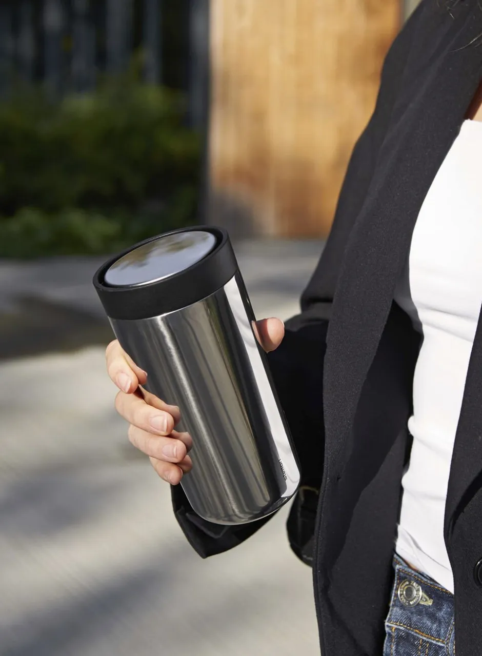 Nyd varme og kolde drikke, når du er på tur. To Go Click er den perfekte termokop, når du pendler til arbejde eller studie, går tur med vennerne eller barnevognen og ellers er on the go. To Go Click rejsekoppen på 0,4 l. i stål er lige dele smart design og funktionalitet. Kruset kan betjenes med én hånd ved et klik på toppen, og det er muligt at drikke fra det hele vejen rundt. Tryk igen og To Go Click er lukket. Det dobbeltvæggede termokrus er vakuumisoleret og vil holde din kaffe eller te varm i op til 4 timer – eller kold i 8 timer. Pas på miljøet og undgå engangskopper ved at medbringe din To Go Click kop.