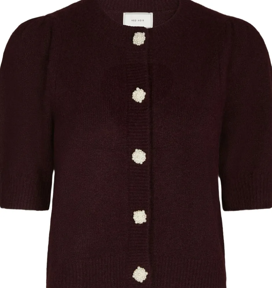 Kort cardigan med pufærmer. Cardiganen har en rund halsudskæring, korte ærmer og lukkes med knapper. Den er lavet i en blød kvalitet, der indeholder uld og har en almindelig pasform. Modellen er iført størrelse 36.