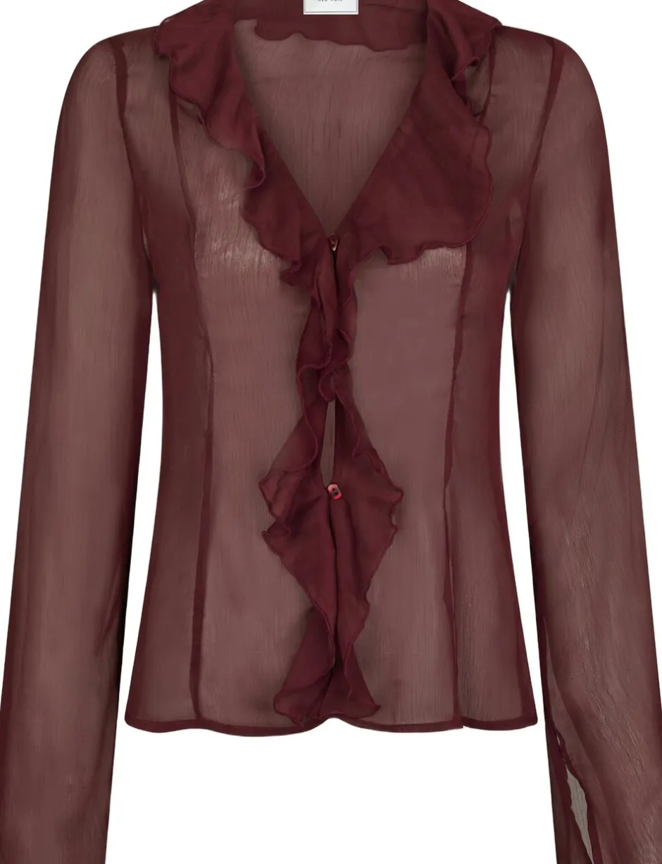 Transparent bluse med lange ærmer. Blusen har V-udskæring, brede ærmer, flæsedetaljer og lukkes med knapper langs fronten. Den har en almindelig pasform. Modellen er iført størrelse 36.