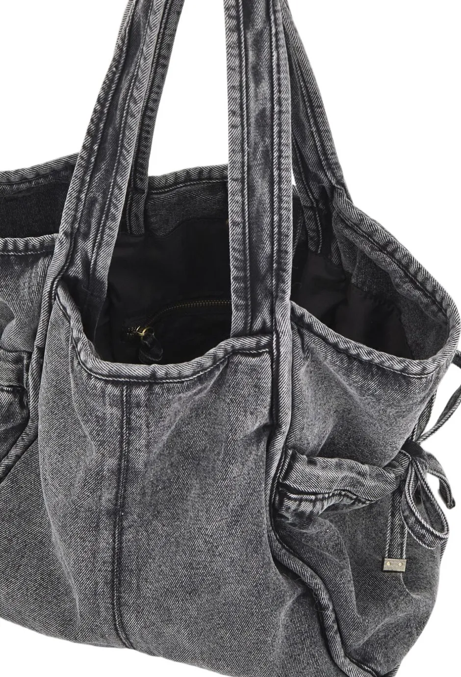 Washed Denima Laurel Bag fra Becksöndergaard er en rummelig taske, som indeholder et stort rum hvori der er en lynlås lomme på indersiden af tasken. Den er udstyret med to fine lommer på hver side af tasken, som spændes ind med snøre, for at give tasken en ekstra detalje. Tasken lukkes med en lille metal hook & eye. Tasken måler 34 x 30, og kan rumme en laptop på 13 tommer og kan enten bæres i hånden eller over skulderen. Den er designet i 100% bomuld.