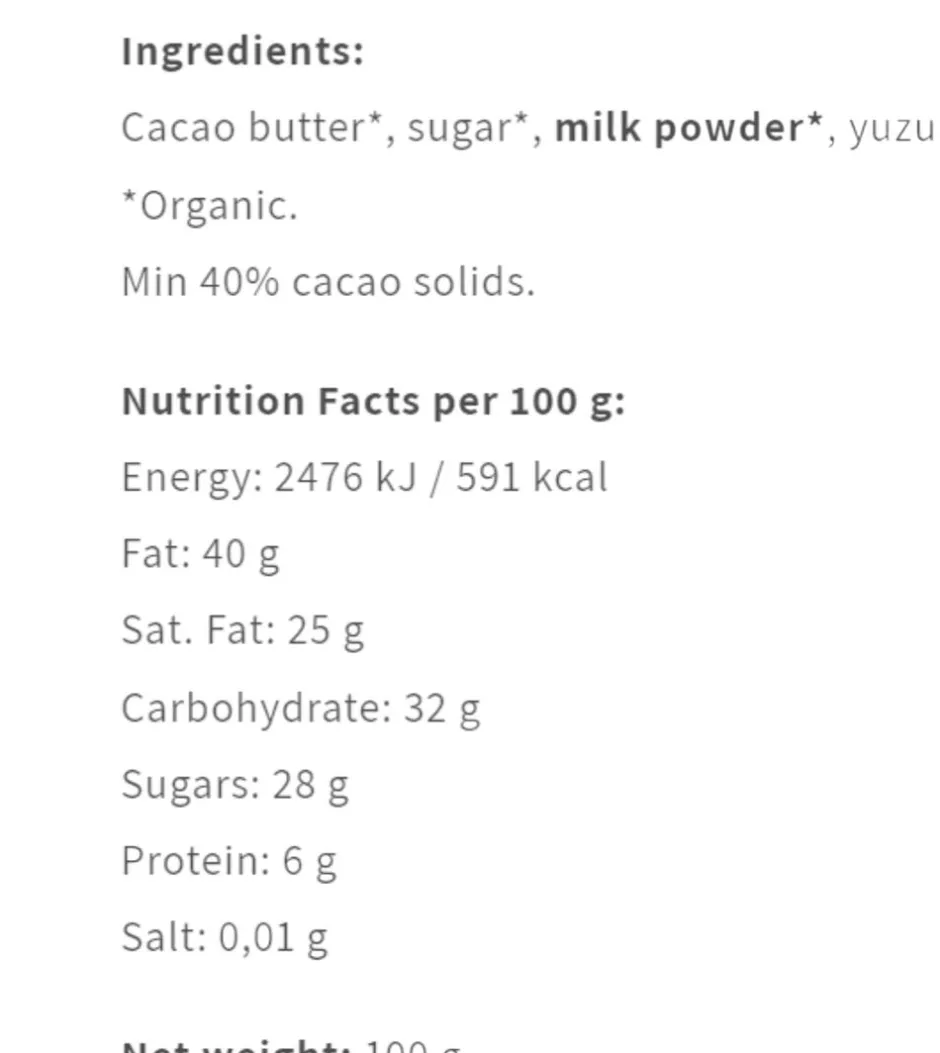 Lavet af økologisk, naturlig kakaosmør fra Ecuador. Den er varm og har kakao-noter, selvom det er en hvid chokolade og den tørrede yuzu-zest kommer fra Wakayama-præfekturet i Japan.