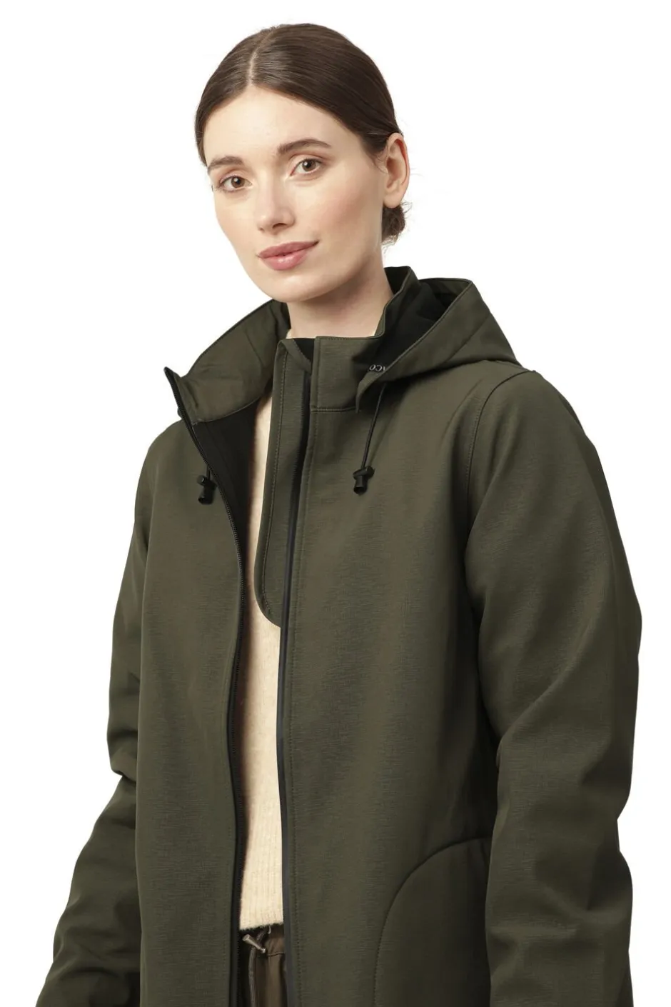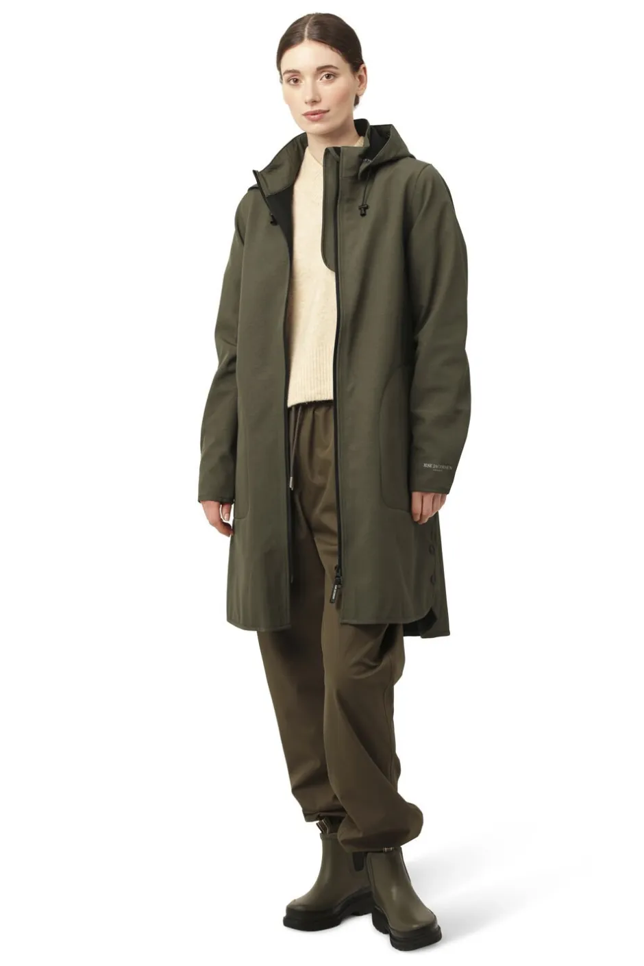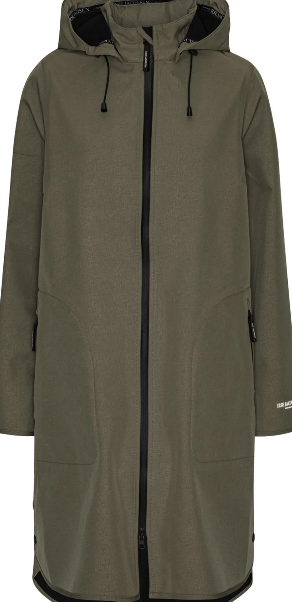 Vandtæt W/P 5000 MM og åndbar M/P 3000 G/M2 Med blød fleece på indersiden, som giver komfort og varme Med den snavs- og vandafvisende overfladebehandling Ecorepel Limede sømme Vandtæt AquaGuard-lynlås Feminin A-formet silhuet Aftagelig hætte Denne funktionelle, feminine og alsidige regnjakke med påsatte ærmer fra ILSE JACOBSEN HORNBÆK har en komfortabel pasform med en flatterende silhuet i A-form. Det strækbare ydermateriale består af 3 lag med en TPU-membran (termoplastisk polyurethan), der er vandtæt og åndbar. Derudover har den et unikt cylinderprint. Softshell-regnfrakken har blød fleece på indersiden, som giver unik komfort og varme. Regnjakken har limede sømme, som hindrer vand i at trænge ind i sømmene. Derudover har modellen en aftagelig hætte, slidser i sidesømmene og en trykknap ved ærmerne, der beskytter mod vinden. Overfladebehandlingen Ecorepel sikrer, at tøjet holder længe, og at det er snavs- og vandafvisende. Teknologien er miljøvenlig, uden fluorkarboner samt er bionedbrydelig. Du kan genaktivere Ecorepel-behandlingen efter vask ved at tørretumble regnfrakken ved lav varme. Softshell-regnfrakken er udstyret med en YKK AquaGuard-lynlås af høj kvalitet, der gør jakken vandtæt, når lynlåsen ikke er skjult bag en klap. Regnfrakken har en vandtæthedsklassificering på 5000 mm, hvilket er nok til regnfulde dage, mens åndbarheden på 3000 M/P giver dig mulighed for høj aktivitet, uden at du føler dig svedig. Denne feminine softshell-regnjakke fås også i en kort version. Materialer: Ydermateriale 94% polyester, 6% elastan. For 100% polyester Funktionalitet: W/P 5000 MM, M/P 3000 G/M2. Længde foran fra højeste punkt på skulderen: 96 cm (str. 38)