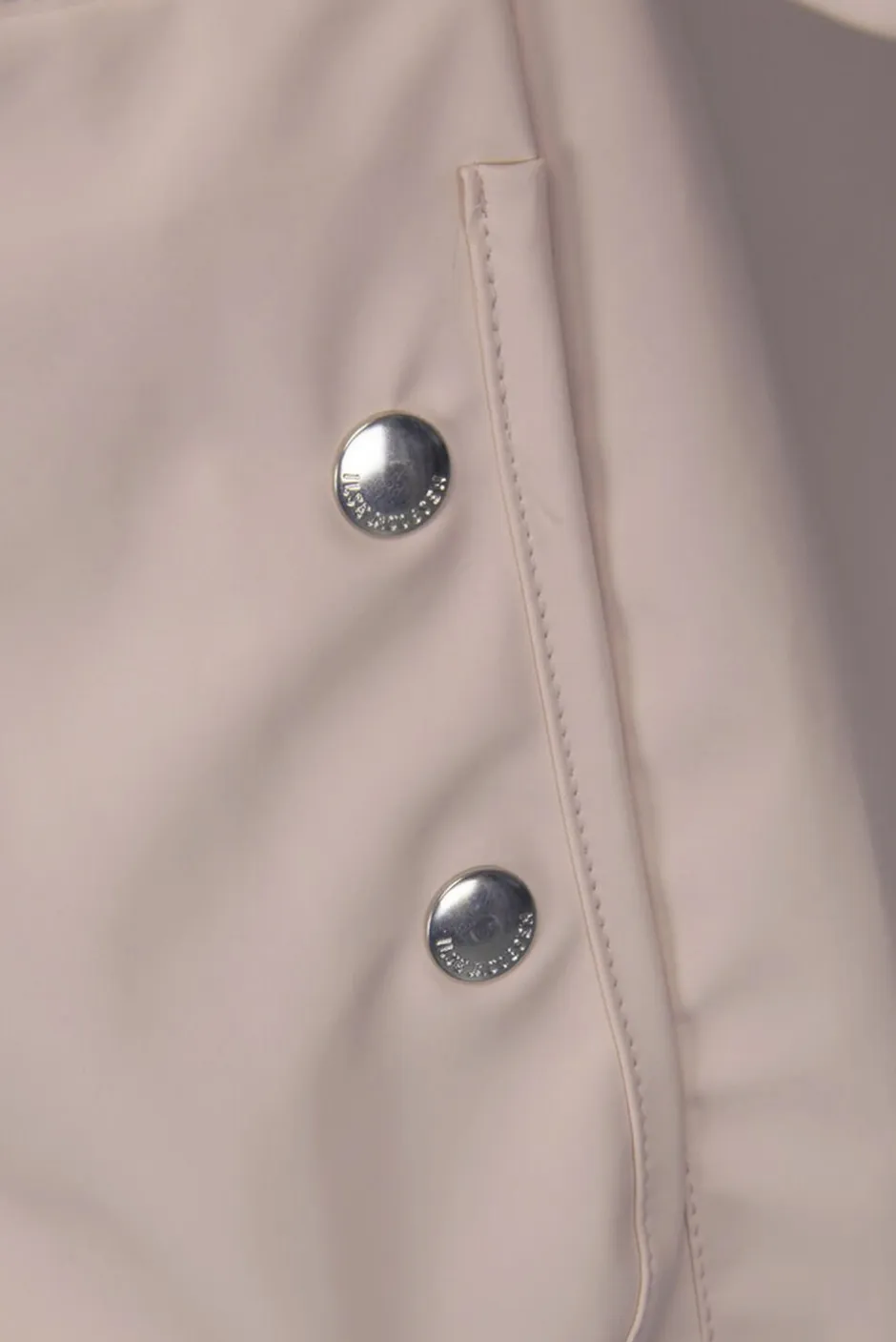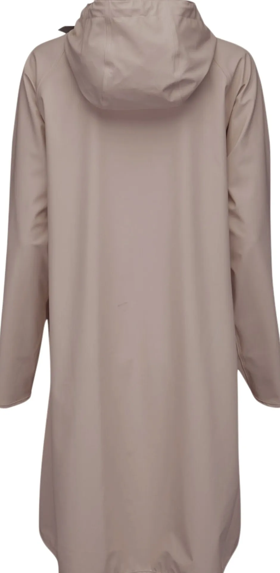 Den ikoniske ILSE JACOBSEN-stil RAIN71 er en feminin A-formet regnfrakke lavet i et let og diskret vandtæt gummieret PU-stof med en trikotbagside. Funktionerne omfatter svejsede sømme, en aftagelig hætte med strop i kunstlæder, slidser i sidesømme og YKK 2-vejs lynlåslukning med storm foran. Regnfrakken har et diskret IJH-logo præget på venstre ærme. En vandtæt klassificering på 5000 mm vil være nok til mellemstore til tunge brusere.