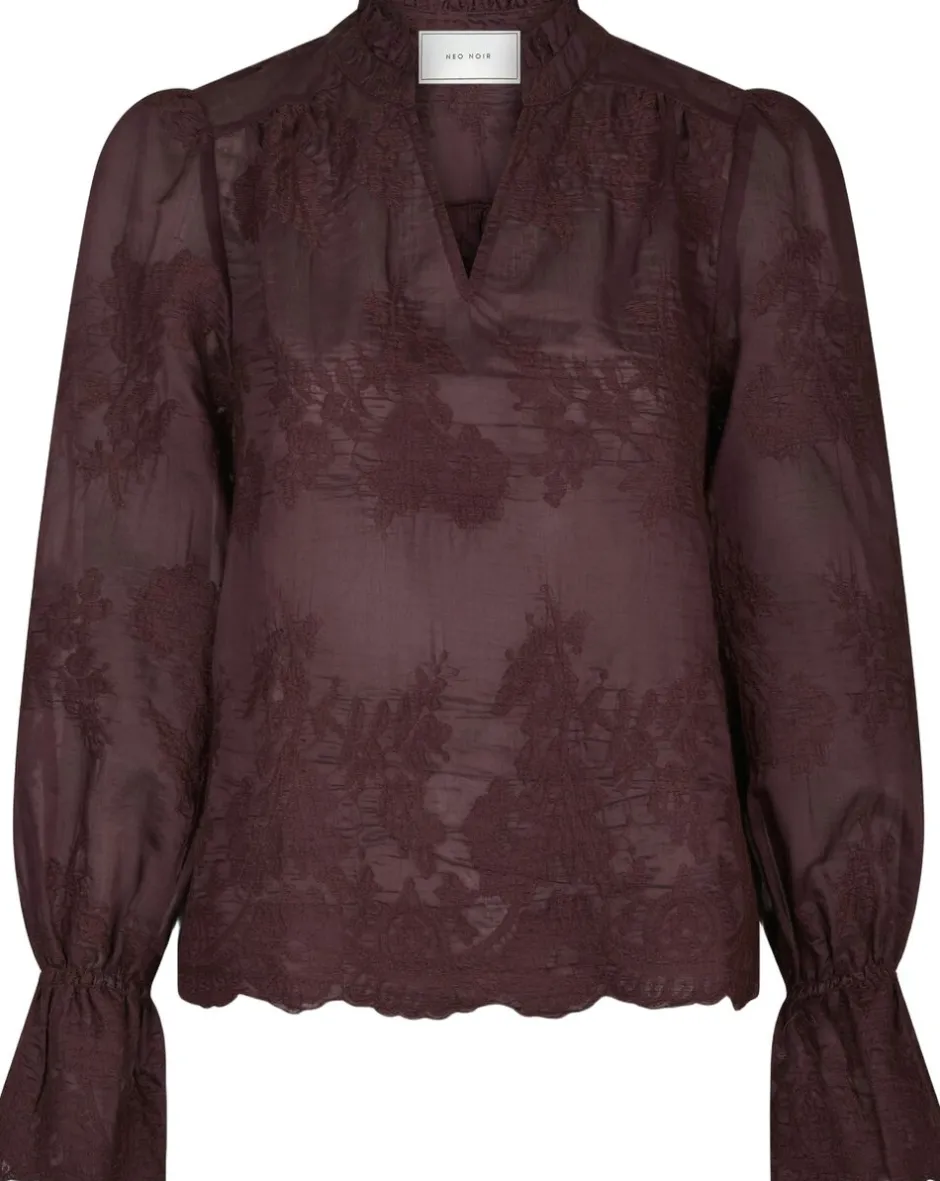 Langærmet bluse med broderede detaljer. Blusen har en V-udskæring med en lille flæsekrave, brede manchetter med elastik samt bølgede kanter. Den er lavet i en bomuldsblanding og har en almindelig pasform. Modellen er iført størrelse 36.