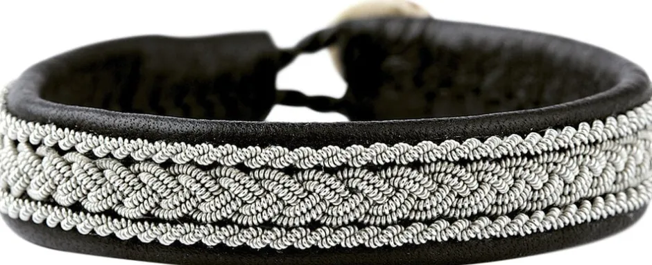 UNDERSØGELSE: Tilføj 1 cm til dit håndled for at finde din størrelse. Håndlavet armbånd med tintråd, der indeholder 4 % sølvflettet på læder- og rensdyrknappen. Bredde: 1,1 cm