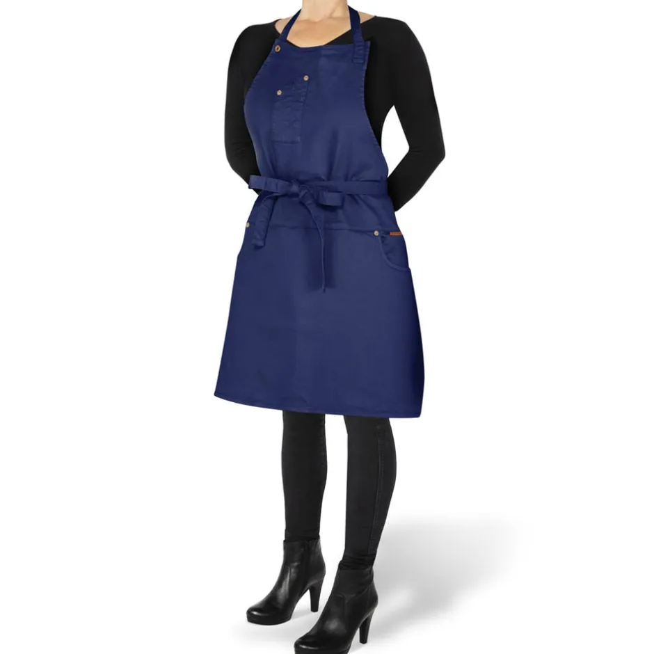 The slim fit model accentuates a more feminine silhouette by a rounded neckline, slimmer side panels and a shorter length than usual. The straps can be used to close the apron at the back or at the front.