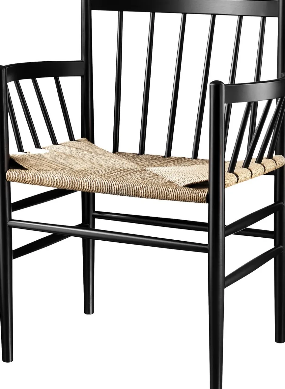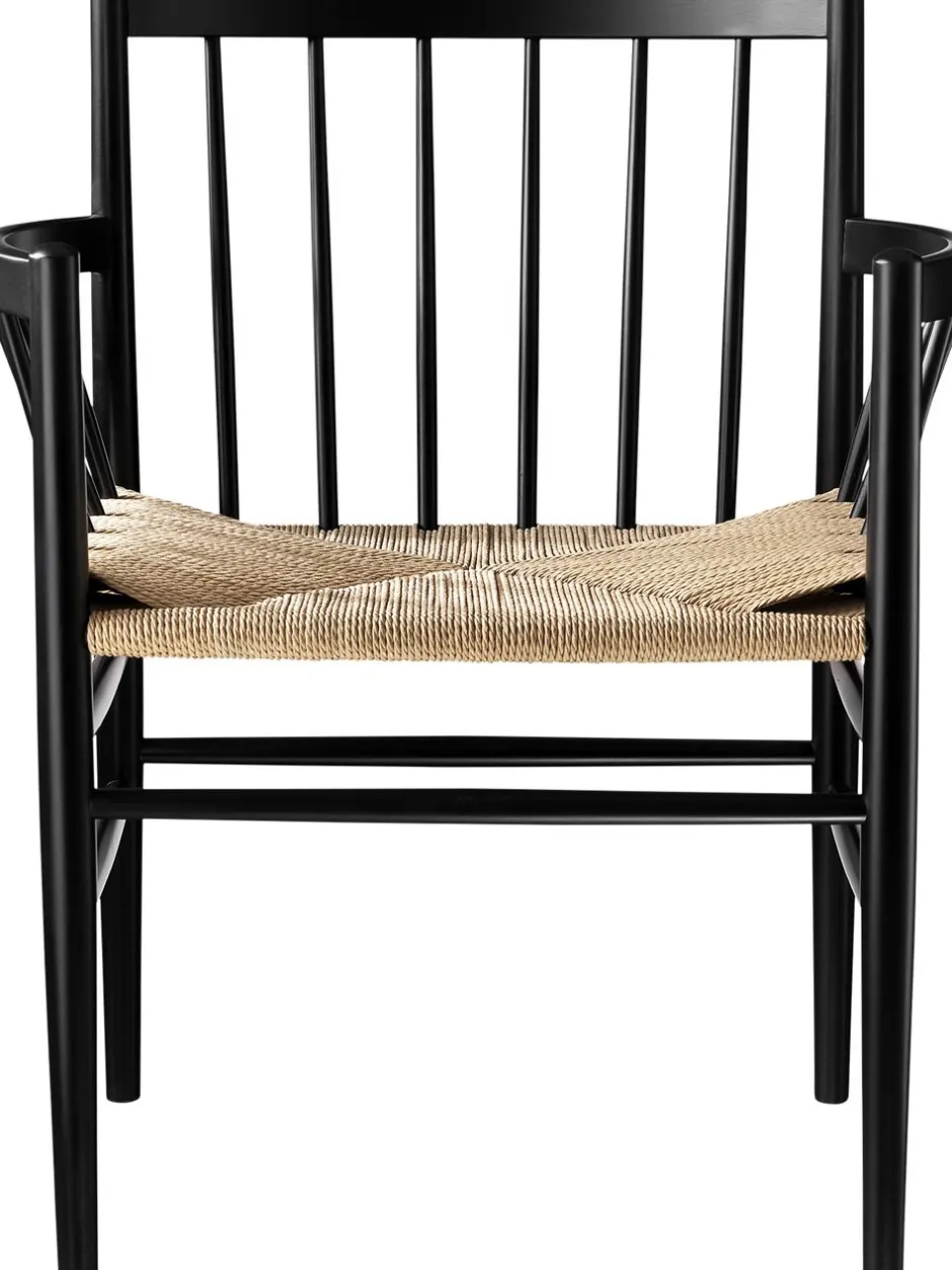 Det er de små detaljer, der har gjort en af de mest komfortable spisestuestole endnu mere komfortabel. Da Jørgen Bækmark tilføjede et armlæn til J81, storebror til J80, blev resultatet både en mere komfortabel stol, men også med en naturlig videreførelse af den buede form i stoleryggen. Desuden er stolen en anelse bredere end J80, hvilket selvfølgelig også giver lidt mere komfort. Designet stammer tilbage fra FDB Møblers guldalder, men proportionerne er justeret lidt, da danskerne i gennemsnit er fem-seks centimeter højere i dag, end de var i 1950’erne. Men ellers fremstår designet som dengang – og samtidig helt nutidig og aktuel. Stolens fletsæde giver ekstra siddekomfort og stolen egner sig derfor godt som spisebordsstol, men også som fritstående møbel i entré. J81 Jørgen Bækmark Spisebordsstol med armlæn Designer: Jørgen Bækmark Type: Spisebordsstol Model: J81 Materiale: Bøg Flet: Natur Farve: Sort/natur Behandling: Lakeret Leveres samlet: Ja Kan stables: Nej Vedligeholdelse og pleje: Aftørres med opvredet klud Ryghøjde: 82 cm Siddehøjde: 44,5 cm Sædedybde: 39,5 cm Armlænshøjde: 68 cm Ydermål på ben: 55 cm Mål: Højde x Bredde x Dybde: 82,0 x 65,3 x 53,3