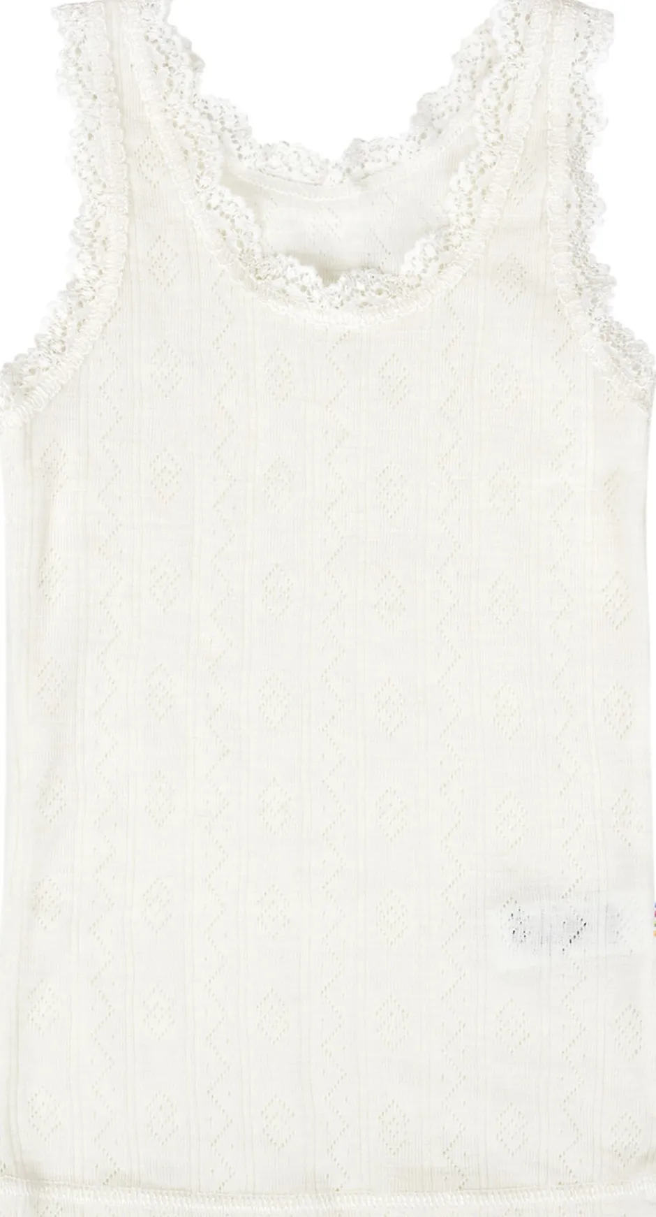 Undertrøje. Sød blondekant i hals og i ærmegab. Ekstra fin uldkvalitet med silke. Utrolig blød og med et lidt skinnende udtryk samt et sødt hul mønster. Ensfarvet. Ecolabel mærket.