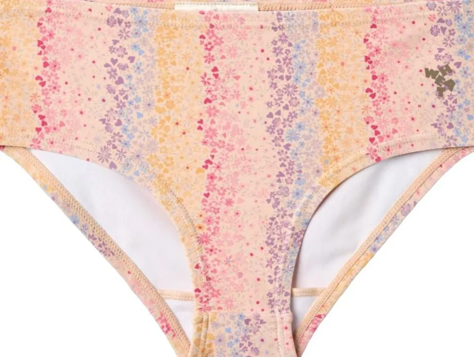 Skøn biniki med smockdetaljer til børn. – Overdel: Smockdetaljer samt tynde stropper med sløjfer – Underdel: Elastik i taljen – Håndtegnet signaturprint Denne bikini er perfekt til en varm dag på stranden, ved poolen, i haven eller blot i svømmehallen. Bikinioverdelen har tynde stropper med en fin lille sløjfe på toppen. Underdelen har elastik i taljen for god komfort. Al badetøj er overvejende produceret i genanvendt polyester, og er Standard 100 fra OEKO-TEX® certificeret. Forlæng dit badetøjs levetid: – Ved altid at skylle dit badetøj efter badning i klor- eller saltvand. – Ved at følge vaskeanvisningerne — – Standard 100 fra OEKO-TEX® – 83% Genanvendt polyester, 17% ElastanSøt bikini med print og smockdetaljer for barn. – Smockdetaljer – Wheat-signaturprint – Smale skulderstropper med små sløyfer Wheats bikini passer perfekt til en dag på stranden eller i svømmehallen. All badetøyet vårt er hovedsakelig laget av resirkulert polyester, og er behagelig for barnet å ha på og bevege seg i. Slik tar du vare på badetøyet ditt: – Skyll alltid badetøyet etter bruk i klor- eller saltvann – Følg vaskeanvisningen — – Standard 100 by OEKO-TEX® – 83% Resirkulert polyester, 17% Elastan