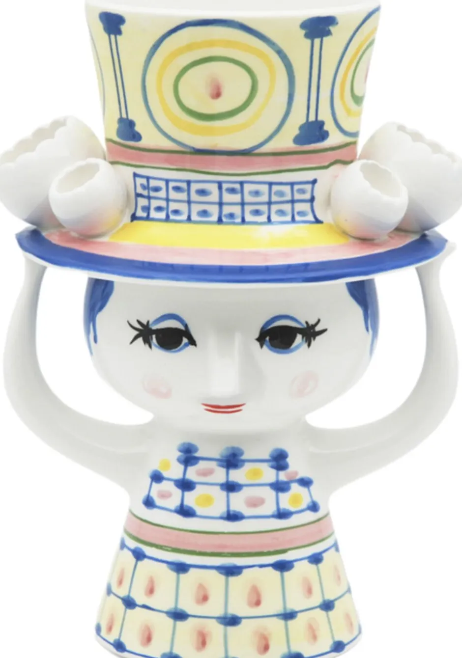 Invitér den nye hattefrøken indenfor, og lad hende skabe glæde i boligen med sine fine farver, finurlige detaljer og håndmalede dekorationer. Bjørn Wiinblad havde en forkærlighed for figurer med hatte, og arkiverne rummer utallige eksempler på, hvordan hatten dukker op igen og igen på nye, kreative og legende måder. Han designede selvfølgelig ikke små, fine pyntehatte. Nej, det var store voluminøse kreationer, der var både skulpturelle og avantgarde i deres udtryk præcis som i serien Lady with hat. Vasen i blankglaseret keramik på 20,5 cm er præget af den blå farve, og skørtets stringente linjer står i skøn kontrast til hattens cirkulære former. Som et lille tårn vokser hatten op mod himlen, mens den fine frøken balancerer den med sine hænder. Det giver vasen et finurligt og fantasifuldt udtryk perfekt til blomsterbuketten i den legende boligindretning. En anden detalje, der er gennemgående i serien, er de små, figurative blomster, der er placeret langs skyggen på hattene. Endnu en dekorativ detalje inspireret af Bjørn Wiinblads originale former og farver. Præcis som Bjørn Wiinblad repræsenterer Lady with hat alt, hvad der er skørt, skævt, kreativt og vidunderligt.