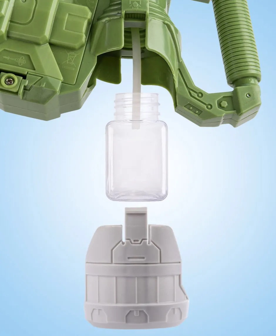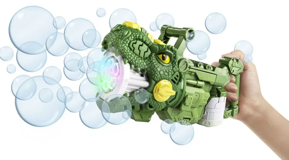 Batteridrevet dinosaur-sæbeboblepistol med lys. Inkl. flaske med sæbeboblevand. Ekskl. 4 stk. AA-batterier.