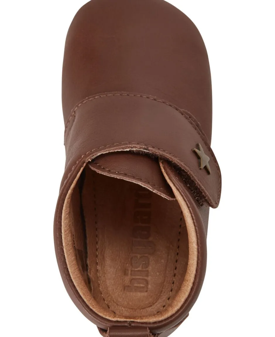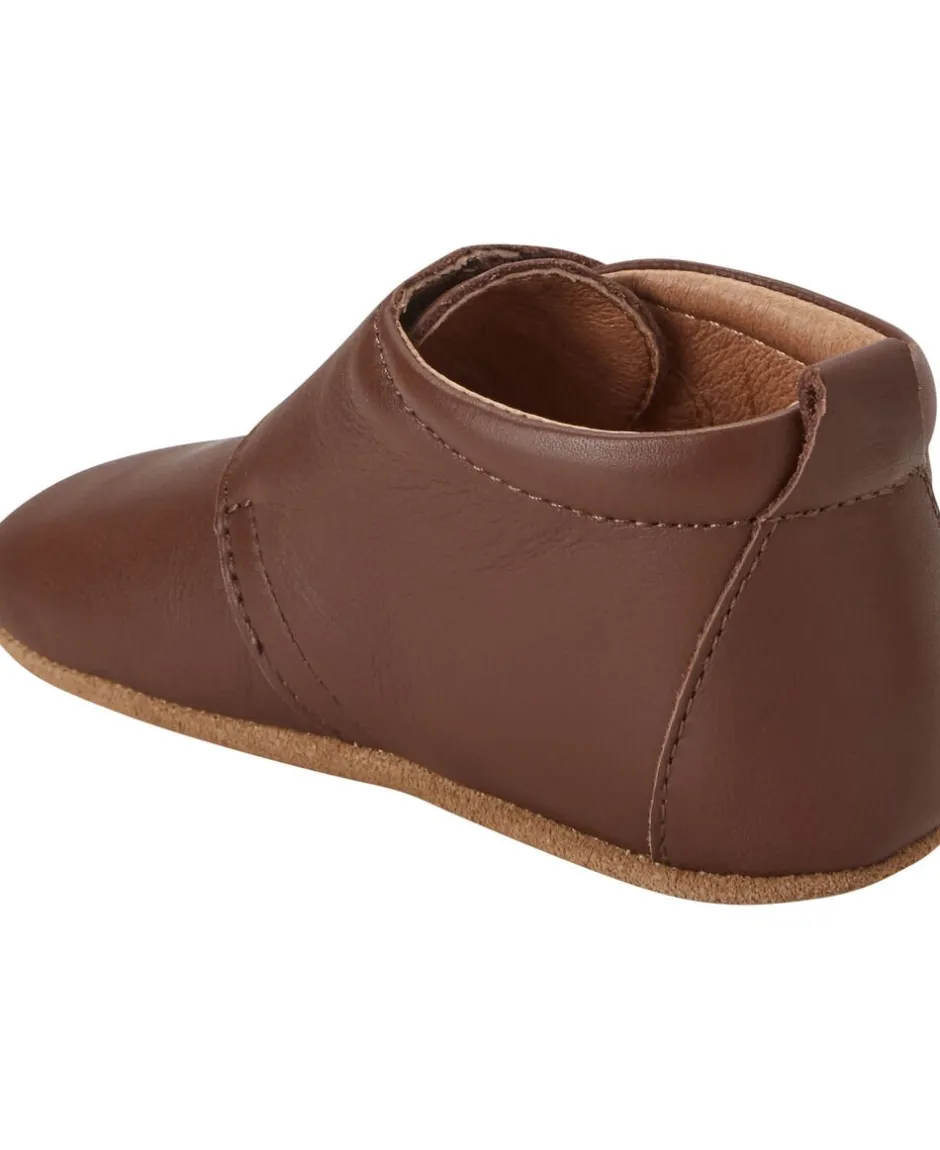 Hjemmesko, velcrolukning. Produceret i 100% naturligt læder, skindfoer og en blød sål af ruskind og skridsikker gummi. Fast hælkappe giver optimal støtte til foden.